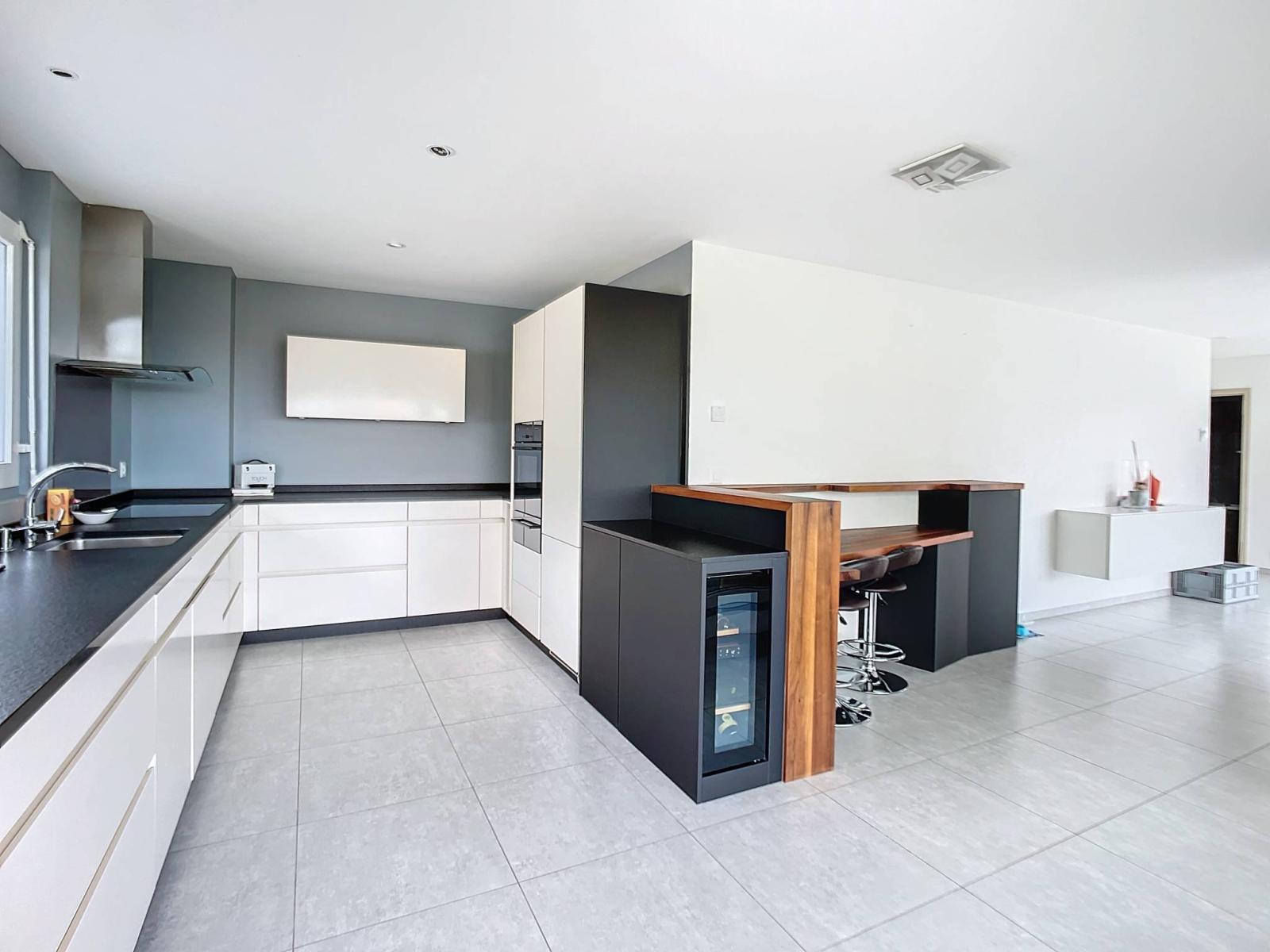 With a living area of over 140 m², it consists of a spacious and bright living room, combining living room and dining room with access to the veranda and terrace. For absolute practicality, this friendly space communicates with a large American-style kitchen fully equipped with high-quality household appliances.