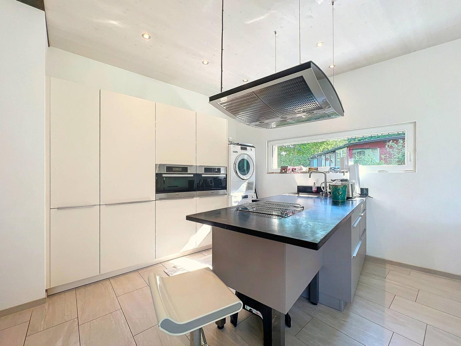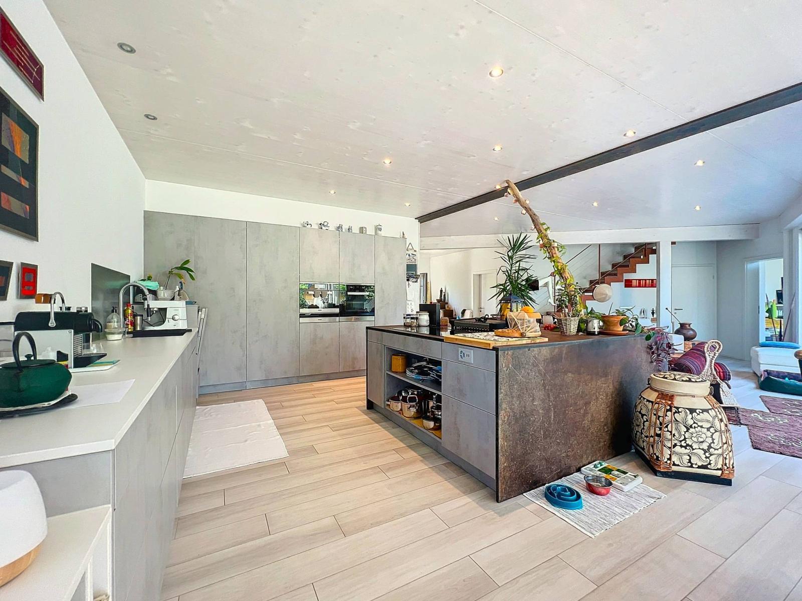 The ground floor of the first 6.5 room house will seduce you from the entrance with its spacious hall leading to a living room, flooded with light thanks to its large bay windows giving access to a large terrace as well as the garden. The modern and fully equipped kitchen has been designed with high quality equipment, such as a hood built into the worktop, a traditional oven and a steam oven. A large storeroom is adjacent to the kitchen, you will access it through a secret door.