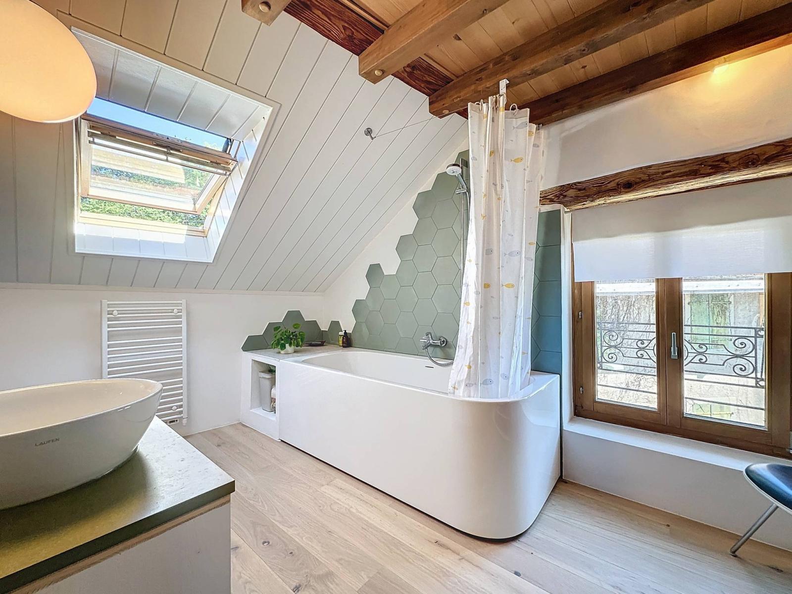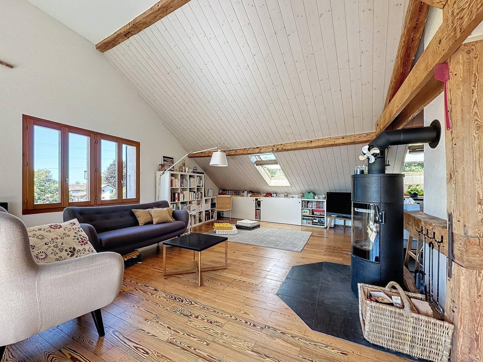 Please note that two cellars, a private garden of 33 m², and a large outdoor parking space (additional at CHF 30,000.-), as well as numerous common areas are added to this "favorite" property, in a rural and bucolic setting.