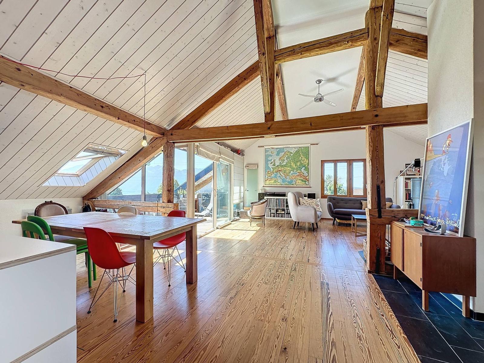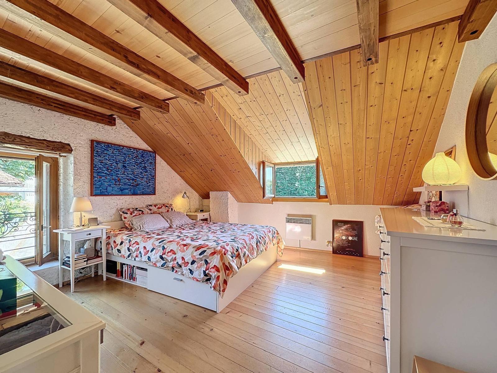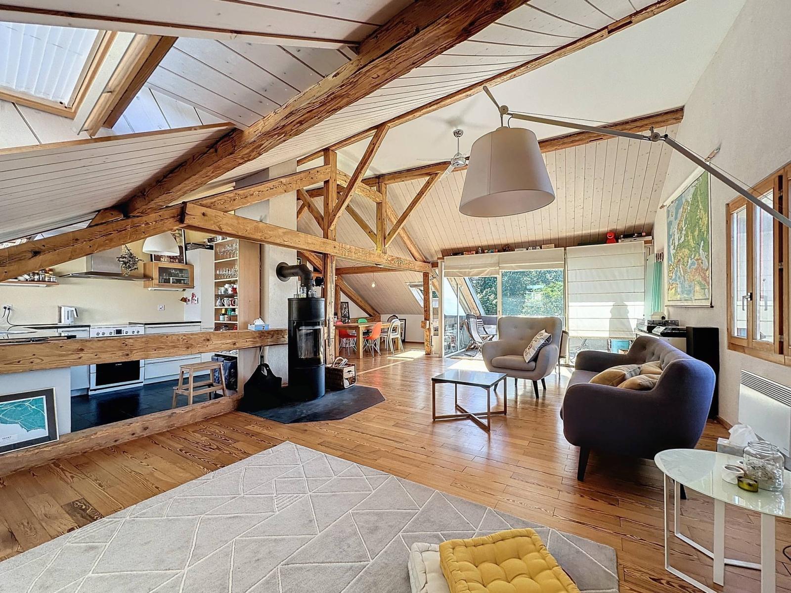 This spacious penthouse with an interior surface area of 95 m², occupies the entire top floor of a four-unit condominium. Created in 2010 with quality materials, it has a bedroom, a mezzanine, an open kitchen, and a bright living room extended by a 10m² balcony with a view facing the lake.
