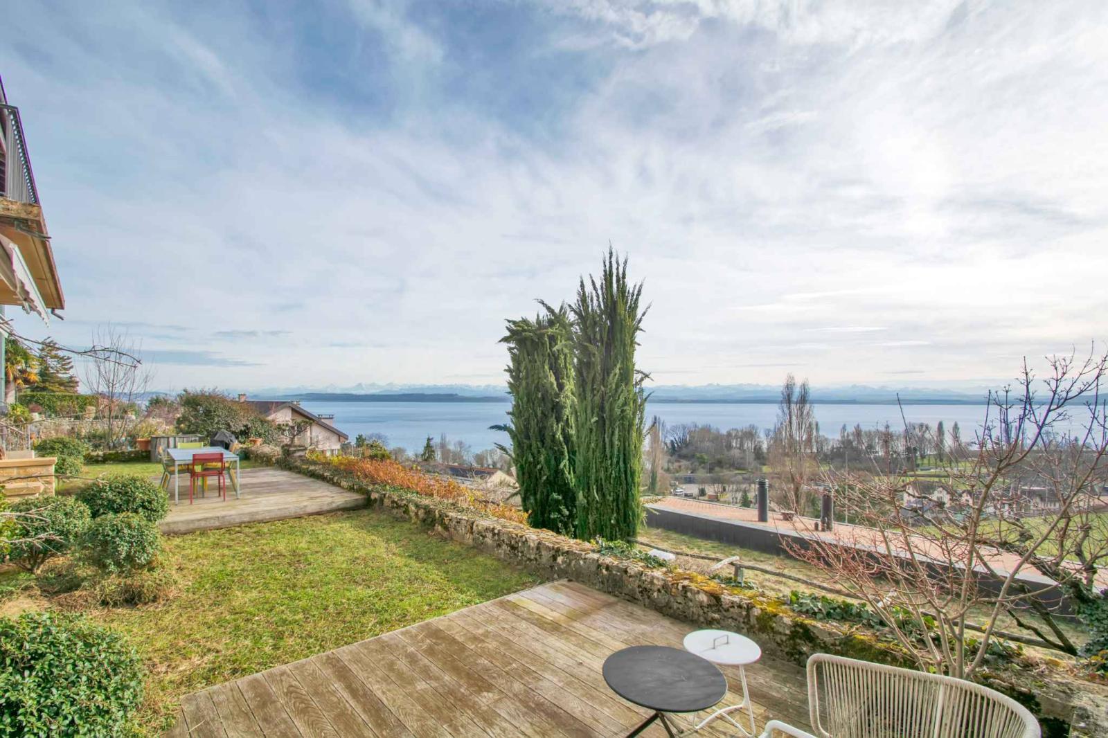 The exteriors are just as attractive: a large garden leads directly to the vines, as well as 2 terraces with unobstructed views of the vines and the lake. On the side of the house a natural pergola offers a shaded space to enjoy summer days.
