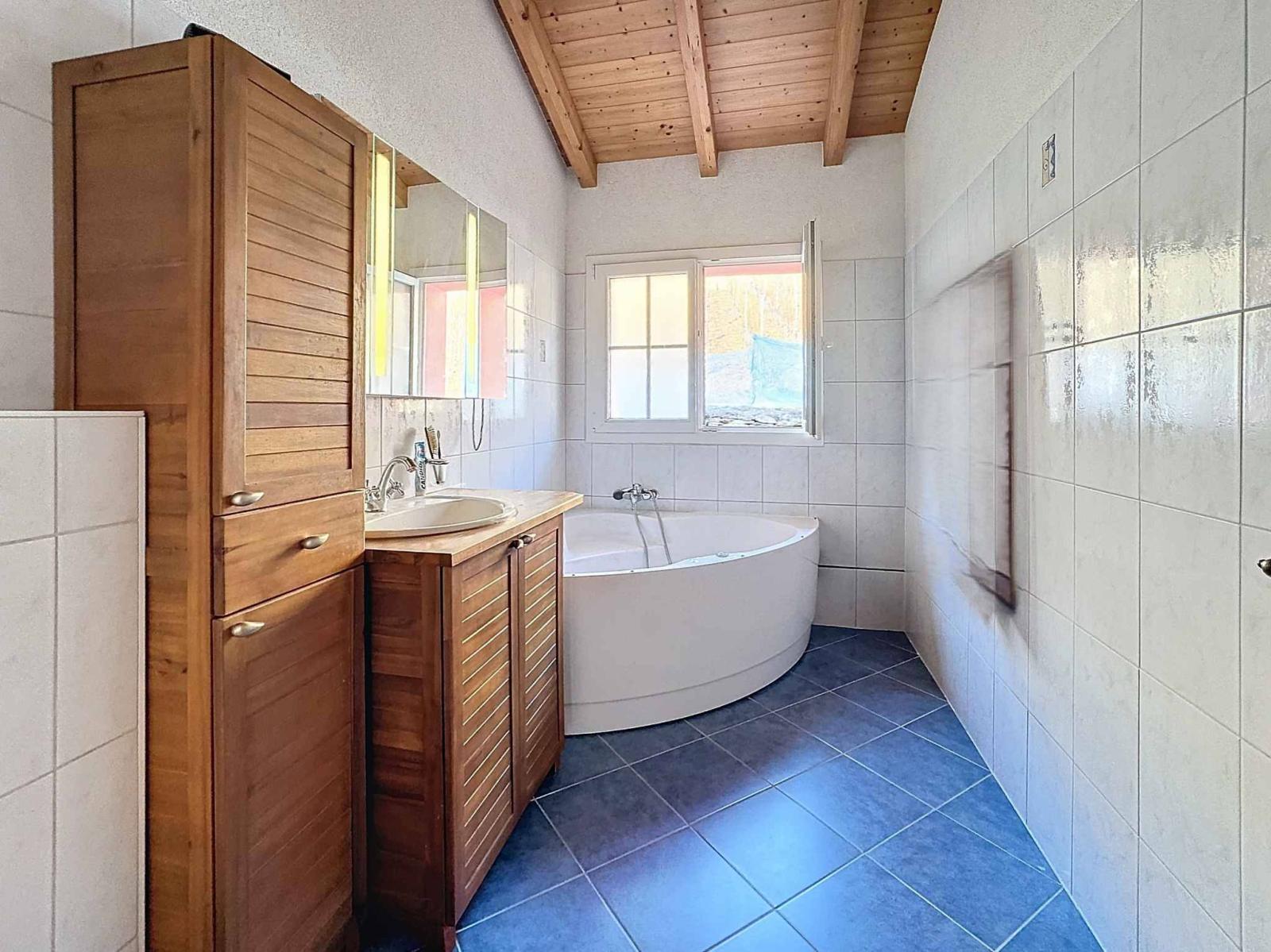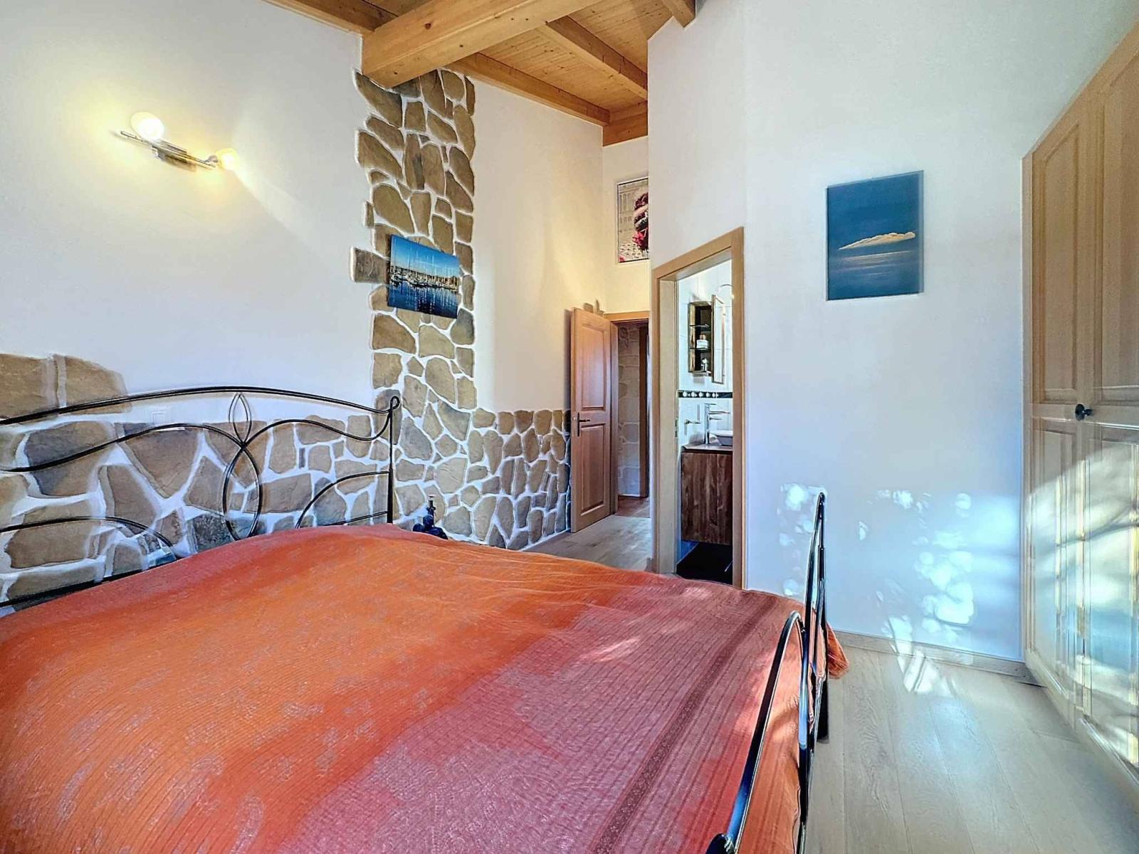 The spaces are distributed as follows: Provencal kitchen with direct access to the terrace, a living room with a beautiful fireplace, a distribution corridor, a North bedroom, a South bedroom with wardrobes, a bathroom/whirlpool/WC/sink and windows, a master suite with adjoining shower room/shower/WC/sink/windows, a technical room.