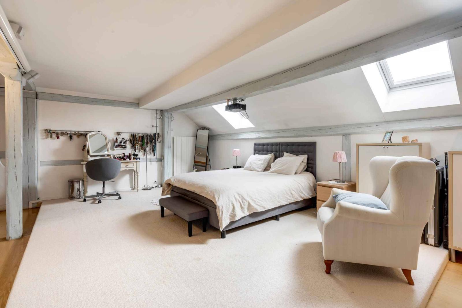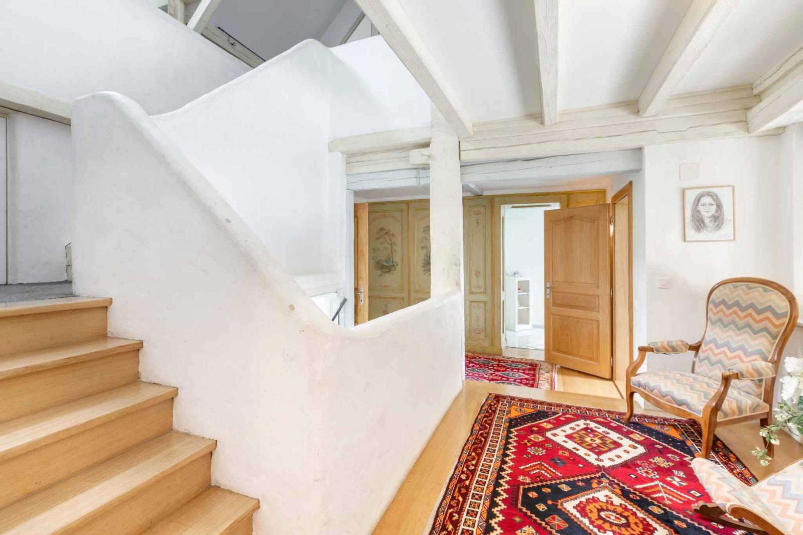 An elegant stone staircase leads to the upper floor, where there is a spacious master suite with dressing room and bathroom, a second shower room, an office, a laundry room as well as several bedrooms and rooms available. The top floor offers two more large bedrooms and several storage spaces.