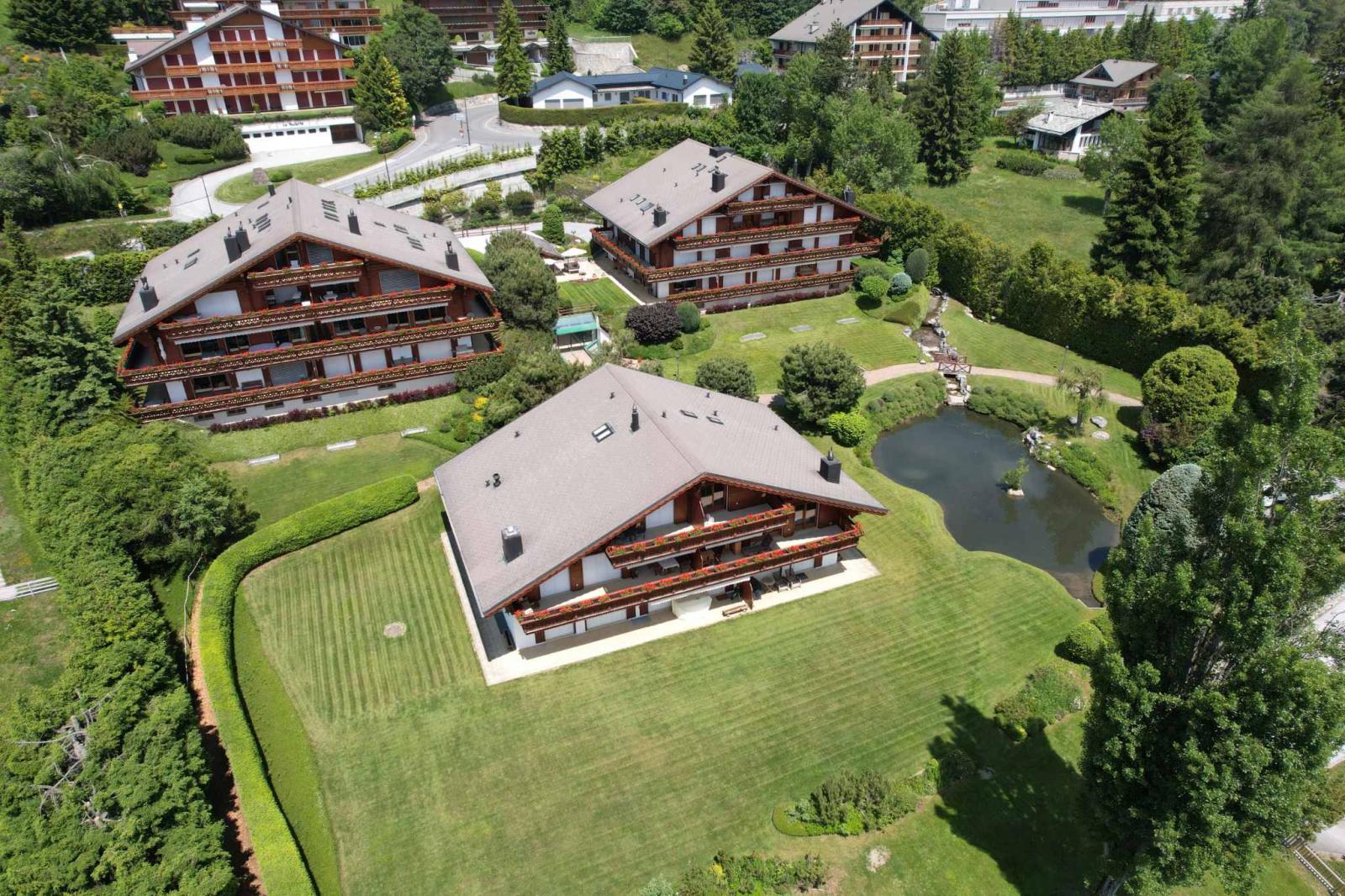 Located in one of the most beautiful residence of Crans, Les Perles de Crans, discover this splendid apartment and its very beautiful garden, benefiting from a nice view and easy access to the center of Crans (approx. 8-minute walk).