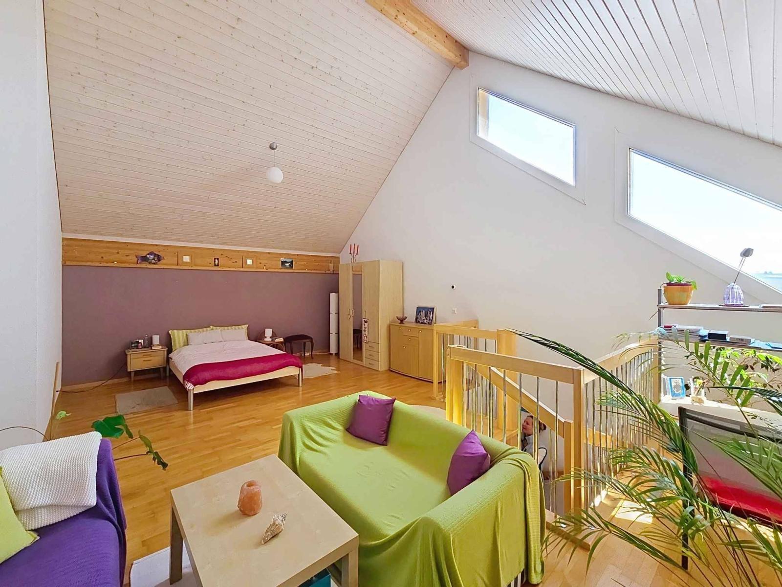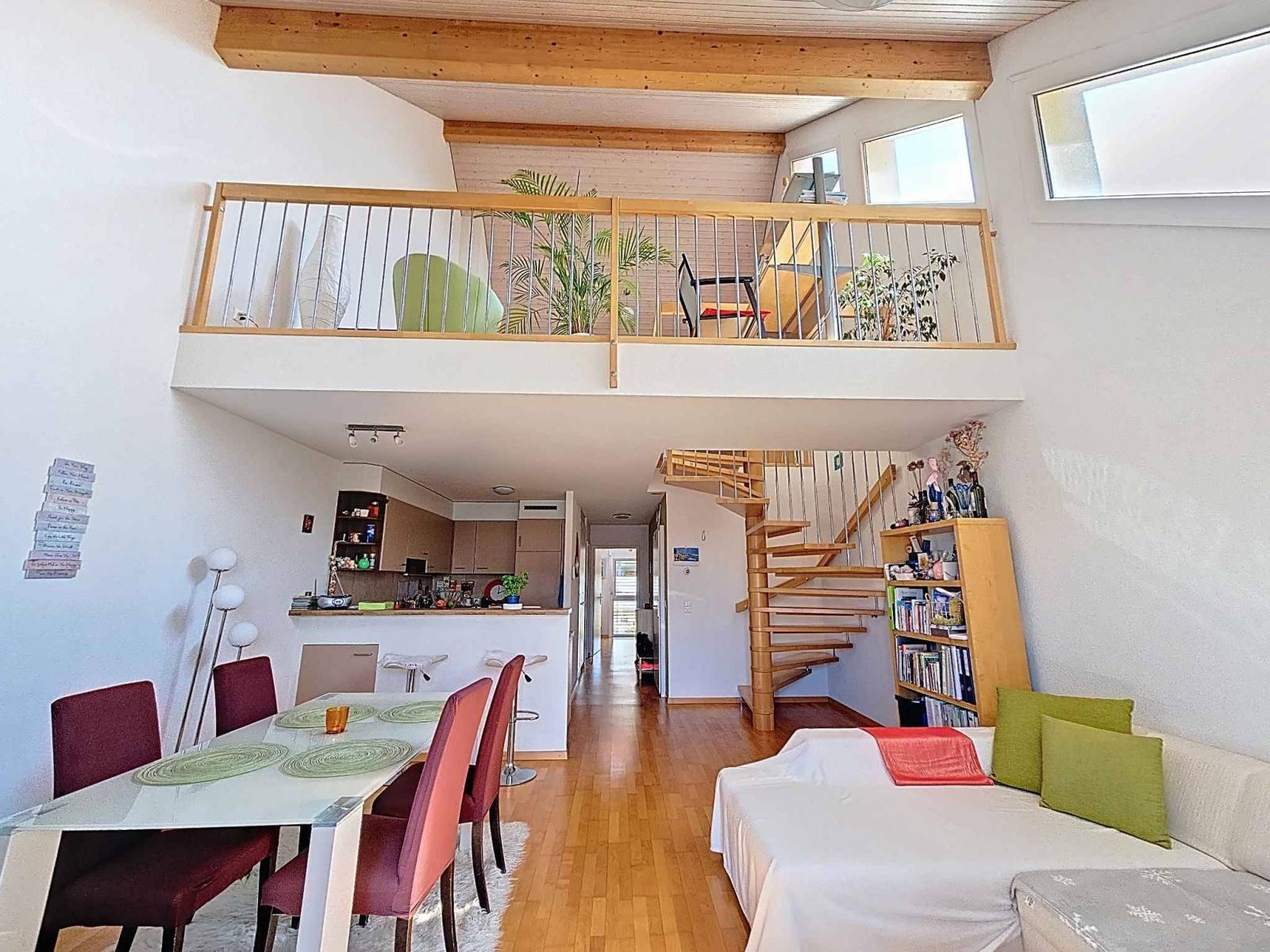 Nestled on the 1st and top floor of a PPE of 8 lots, this 3.5 room apartment (94 m² weighted) including a closed bedroom and a mezzanine bedroom benefits from large volumes up to 5 meters of ceiling height at the maximum. The level including living room-kitchen, bathroom/WC/washing column, bedroom, represents approximately 62 m². Then, upstairs, the mezzanine including a bedroom space and an office area, represents approximately 30 m².