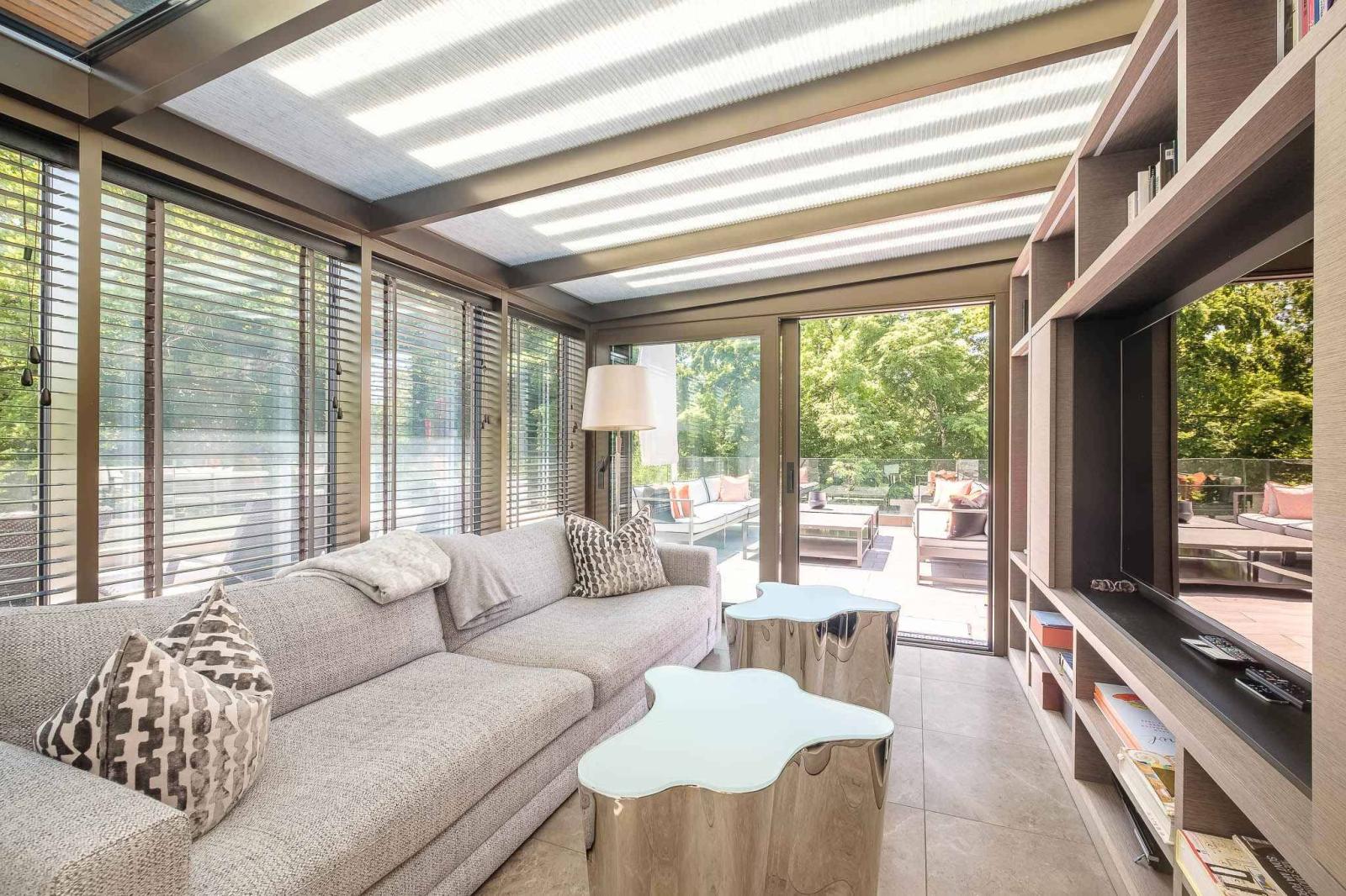 The sleeping area offers two bedrooms, each with its own en-suite bathroom, as well as a master bedroom with a dressing room and adjoining bathroom. An office/bedroom completes this area.