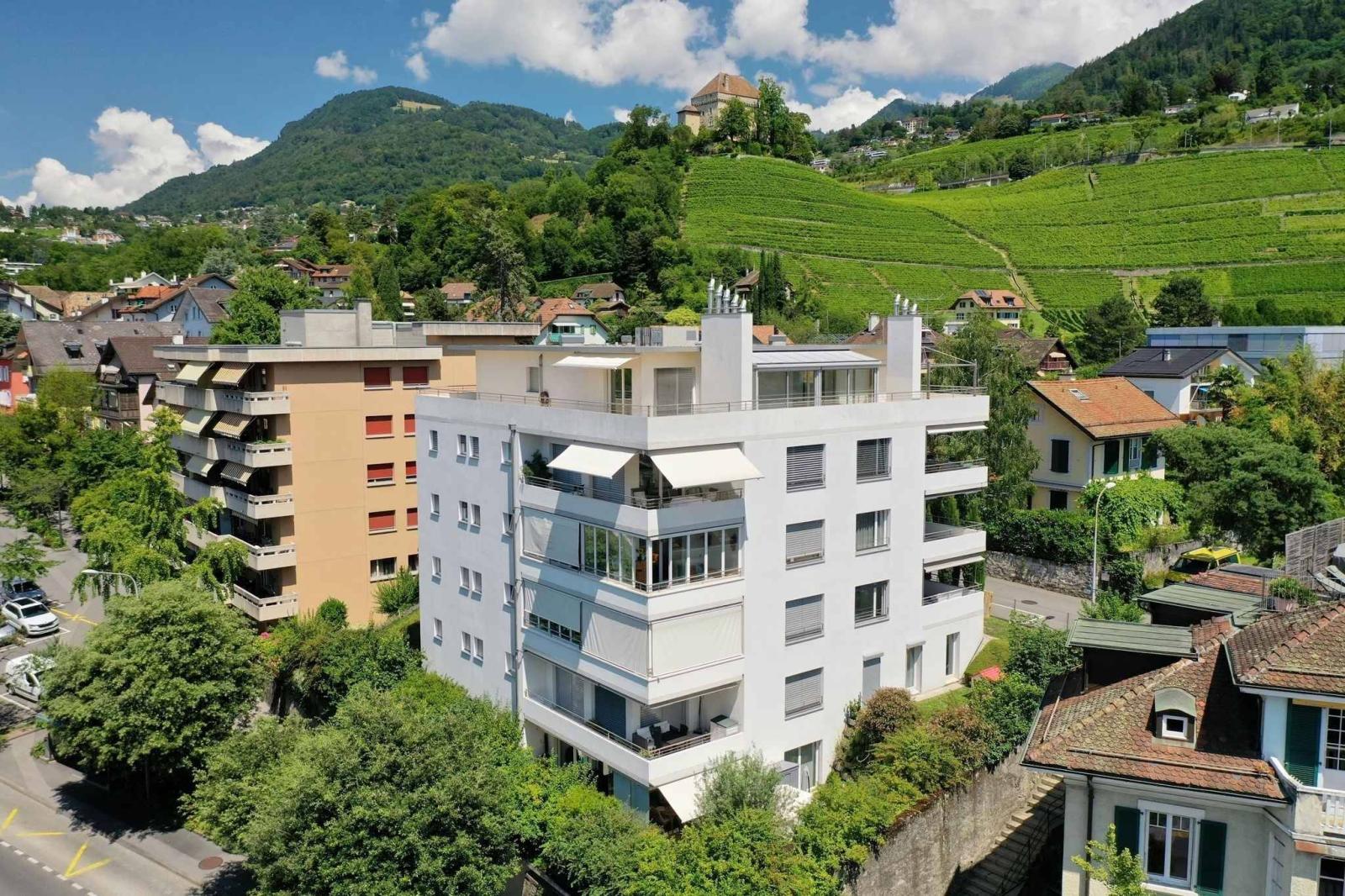 With a weighted surface area of approximately 155 m² (around 130 m² of living space), it enjoys an ideal location less than five minutes from downtown Montreux and only 600 meters from the famous Quai des Fleurs along the Riviera.