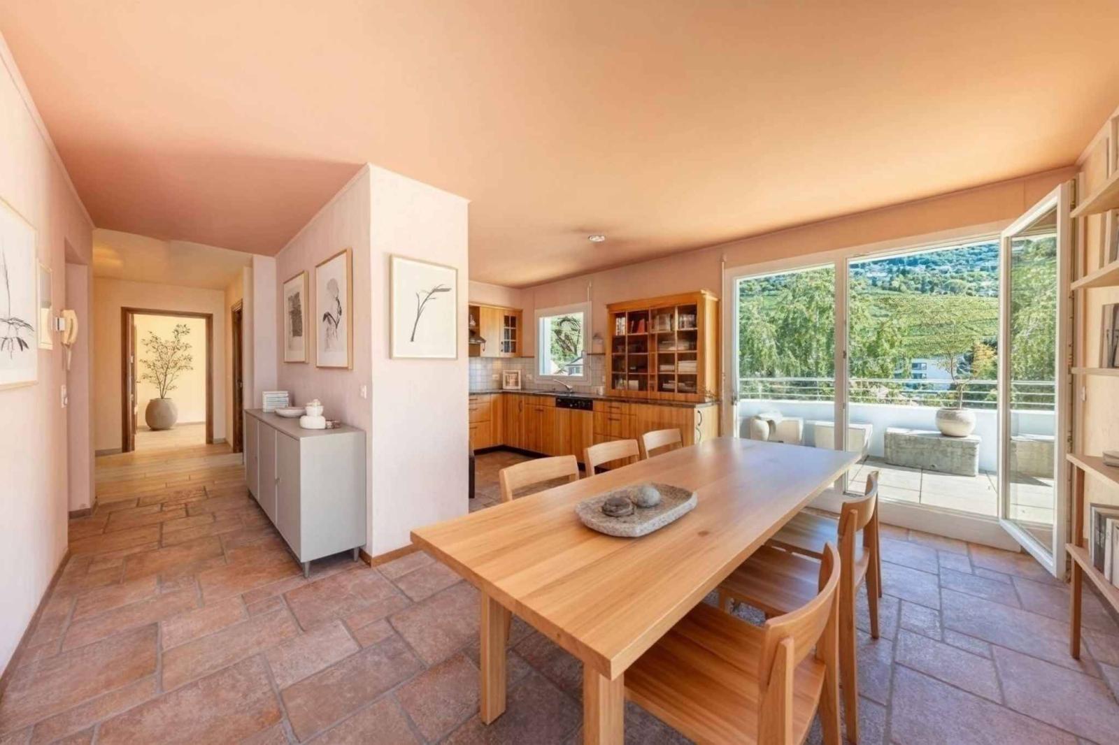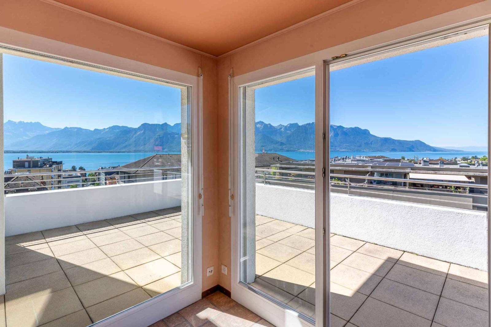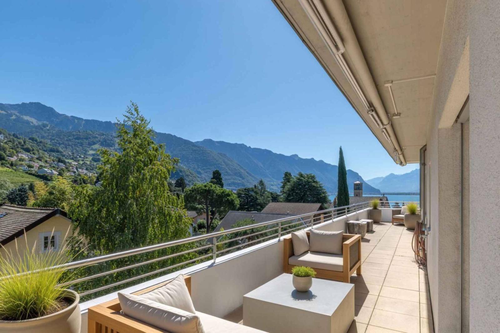 The apartment boasts an exceptional 360-degree terrace of nearly 130 m², offering breathtaking panoramic views of Lake Geneva, the surrounding vineyards, and the Alps.