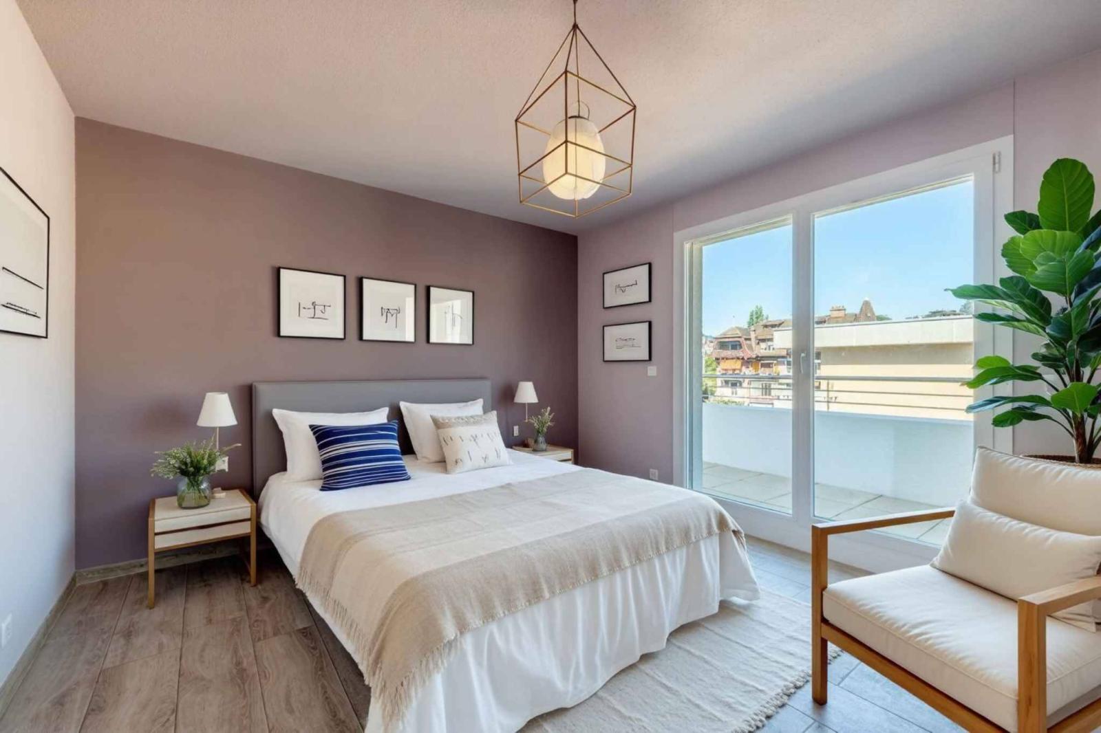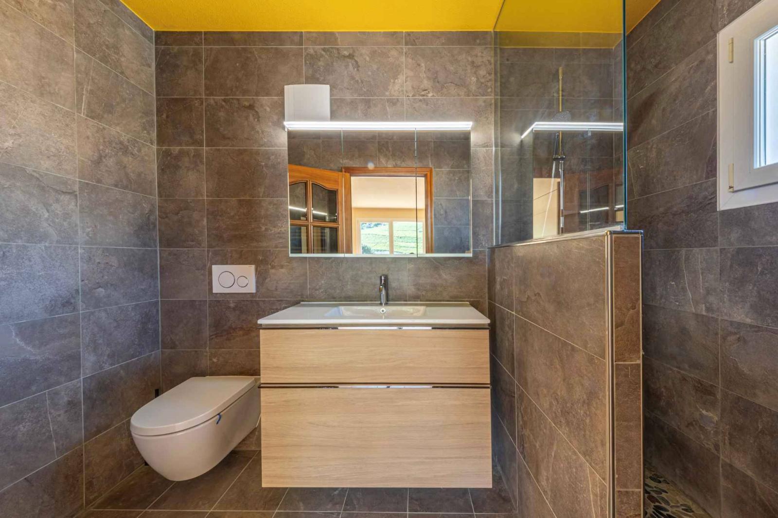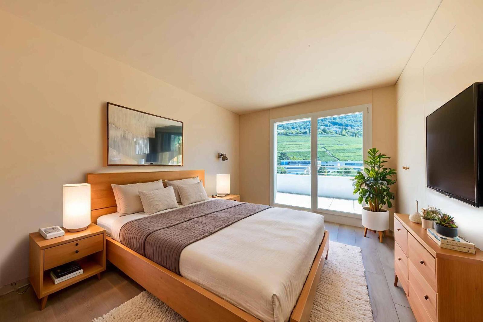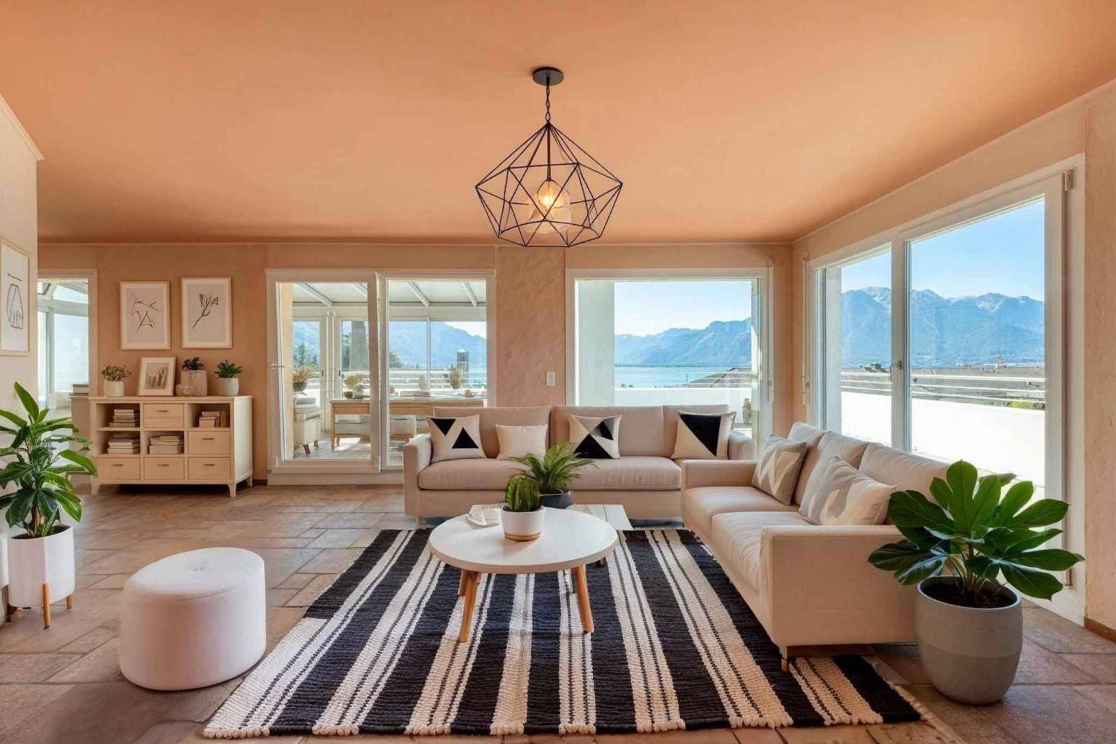 The apartment boasts an exceptional 360-degree terrace of nearly 130 m², offering breathtaking panoramic views of Lake Geneva, the surrounding vineyards, and the Alps.