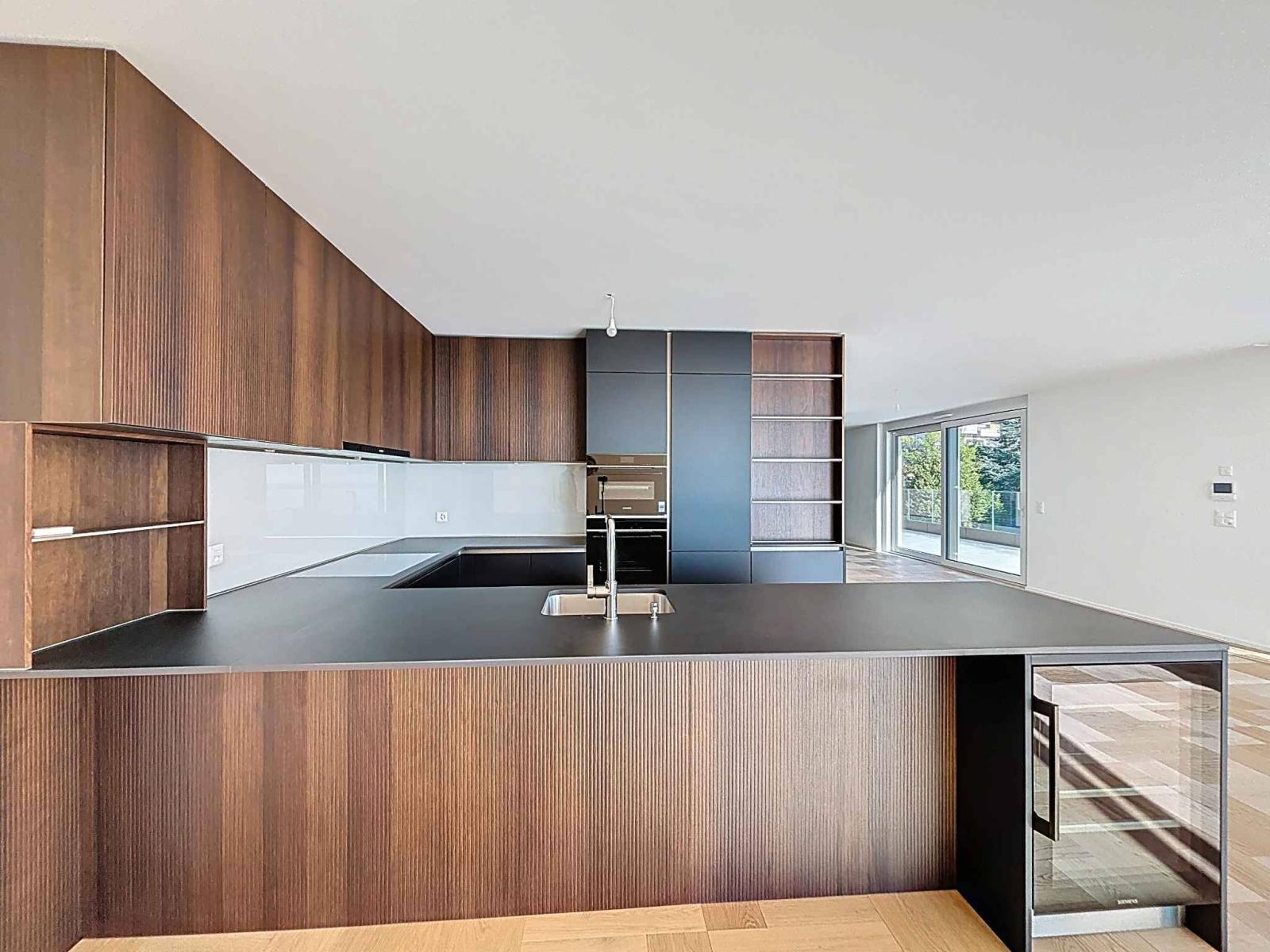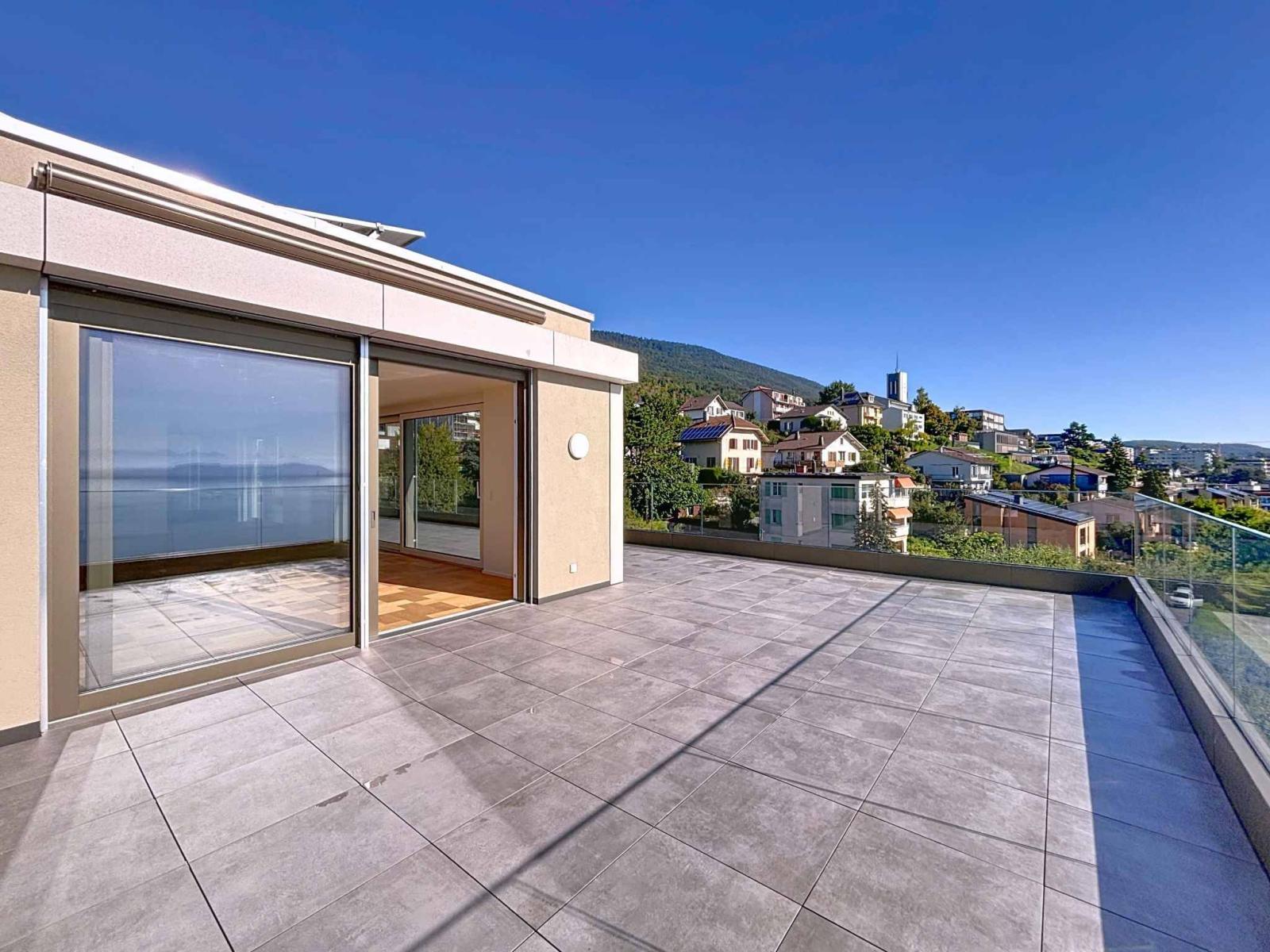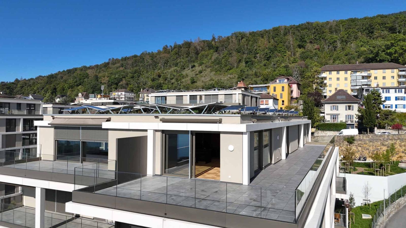 This 3.5-room penthouse apartment, offering 144 m² of living space, boasts refined architecture and a seamless flow between the kitchen, living room, and bedrooms. You'll also enjoy generous outdoor spaces, including a 122 m² south-facing terrace, which offers exceptional views of the surrounding nature and Lake Neuchâtel.