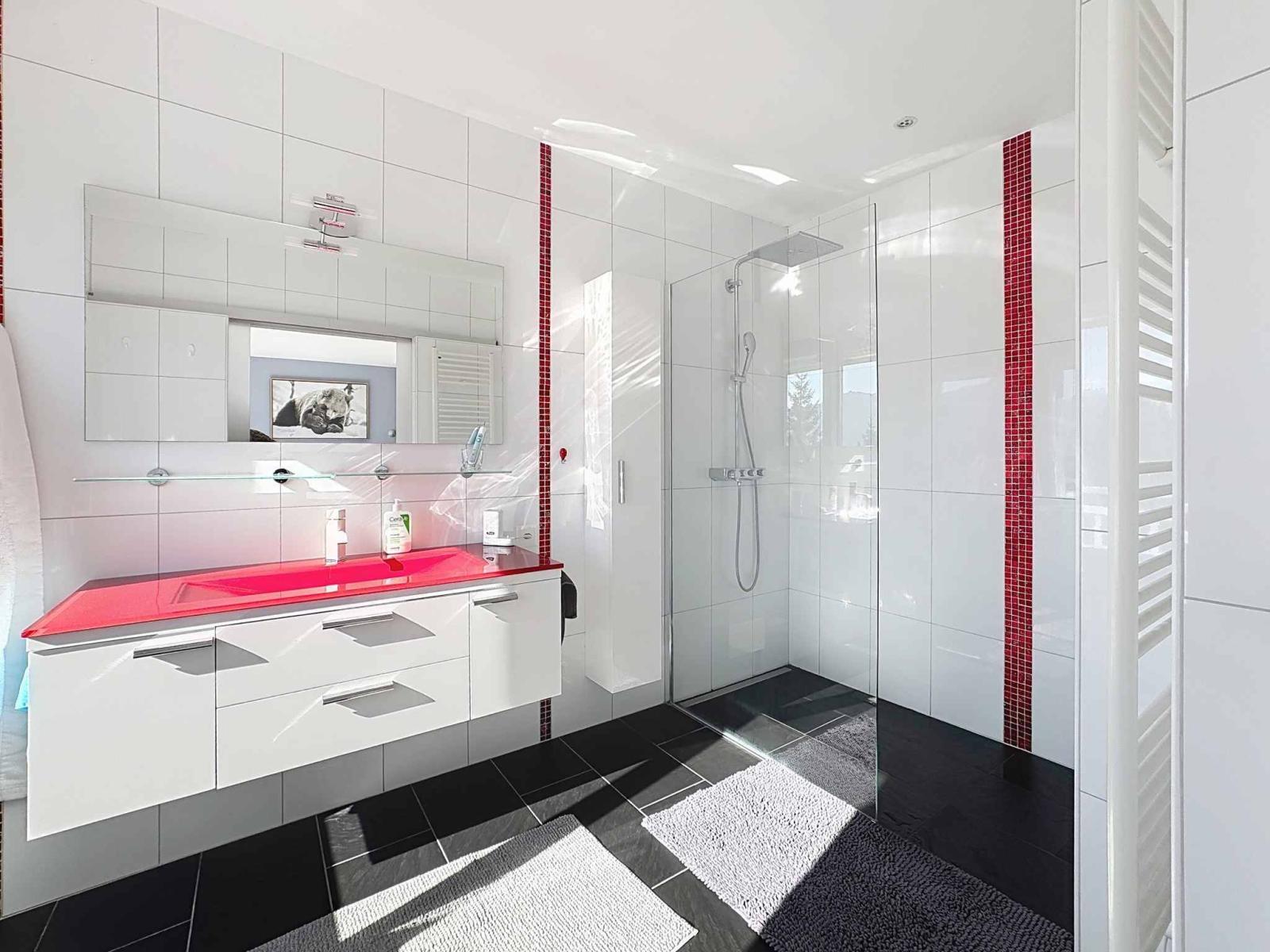 The open kitchen blends seamlessly into the living room, creating a bright and inviting living space. The cathedral-ceilinged living room will captivate you with its panoramic view. Upstairs, a large mezzanine houses a leisure/office area and a TV lounge, perfect for relaxing or spending evenings with the family.