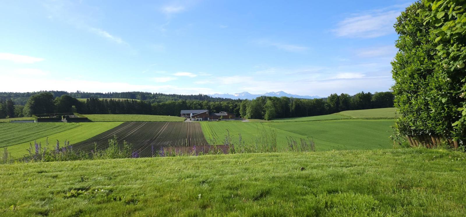 This spacious apartment has a living area of approximately 130 m² and opens onto a terrace and a garden of 604.6 m². These are for exclusive use and offer expansive views of the fields and mountains.