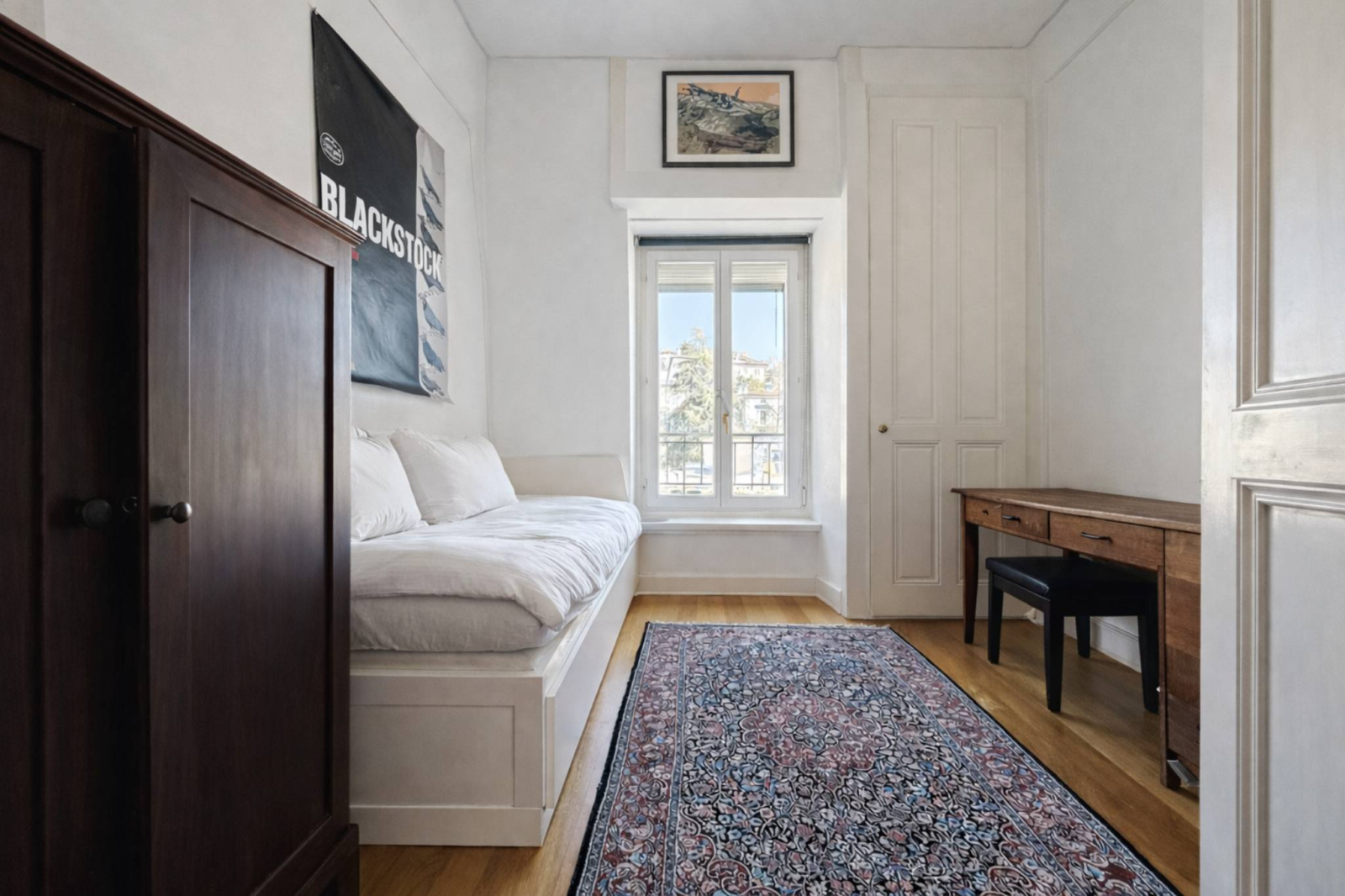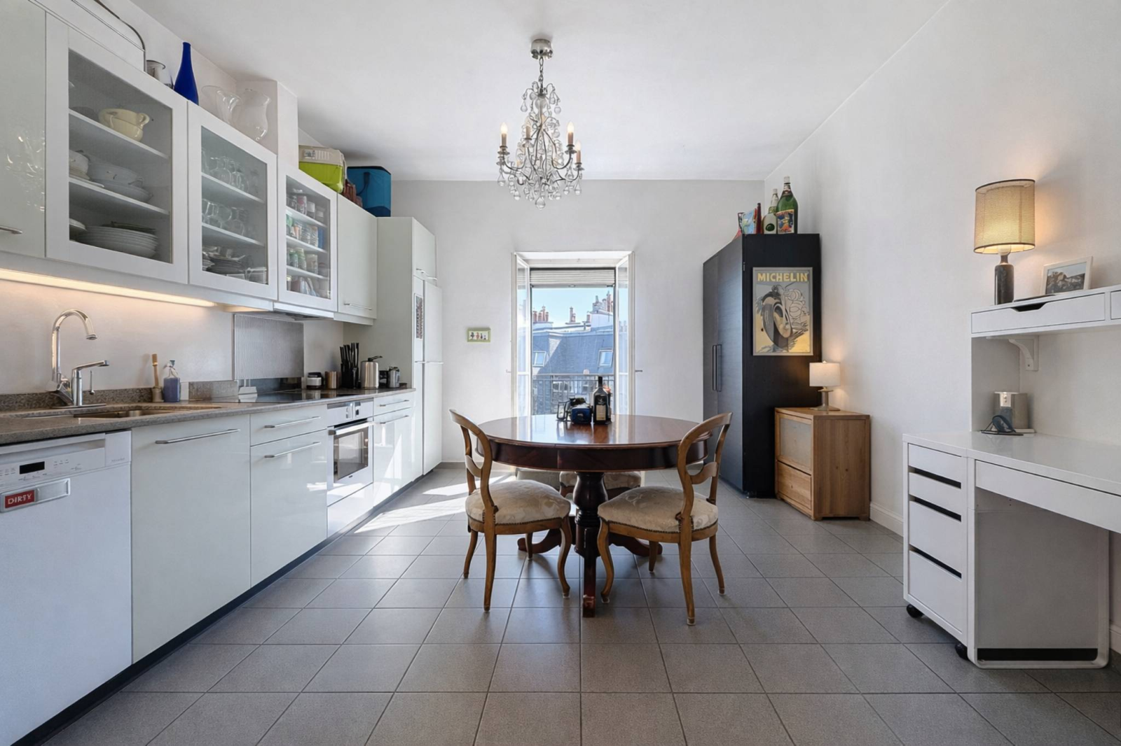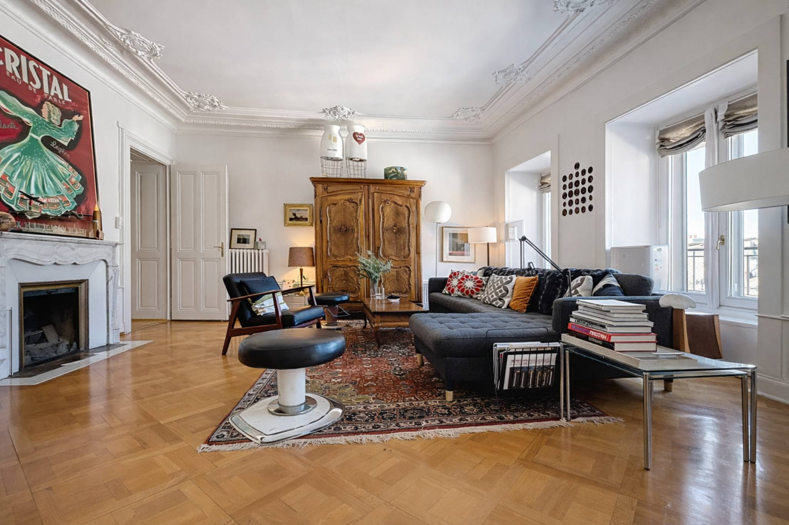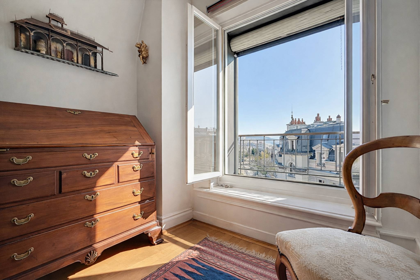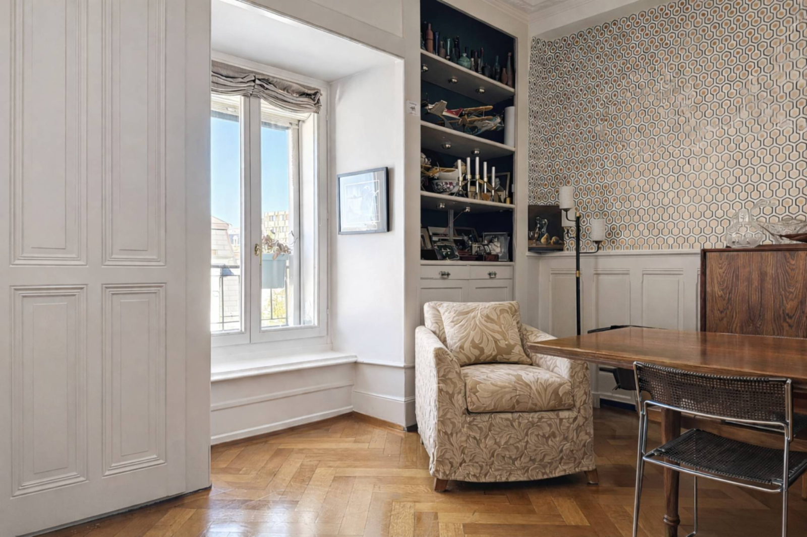 Built in 1914, the building boasts Haussmannian-inspired architecture, recognizable by its orderly facades, delicate moldings, stone window frames, and grand entrance. Behind its history-laden walls, the top-floor apartment offers approximately 151 square meters of generous living space. Herringbone parquet flooring, high ceilings adorned with moldings, period fireplaces in the living and dining rooms, and large windows that flood the space with optimal southeast light: every detail evokes the refinement of the early 20th century. A veranda extends the reception areas, while the classic layout—central hall, enfilade of reception rooms, and separate bedrooms—respects the original character while incorporating modern comforts.