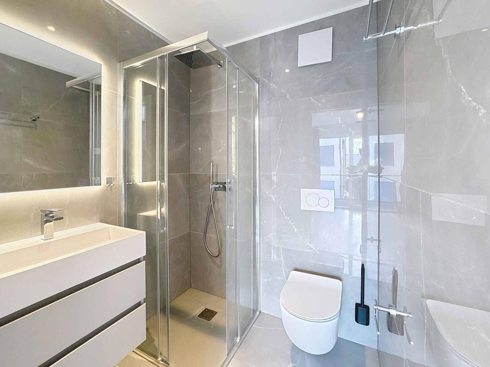 The sleeping area offers all the necessary comforts: an en suite bedroom with private shower room, a standard bedroom ideal for children or guests, as well as a third modular bedroom, which can be converted into an office, children's bedroom or play area.
