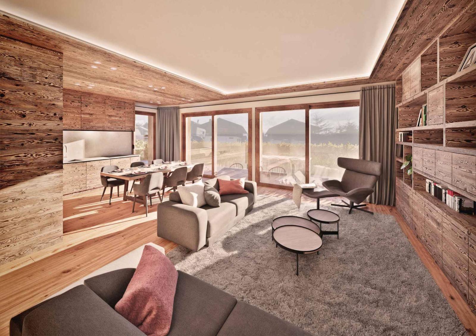 Designed around a welcoming and perfectly oriented living space, the interior opens onto a private terrace, ideal for enjoying alpine views and the beauty of each season. The seamless flow between the living room, dining area and open kitchen creates a warm and inviting atmosphere.