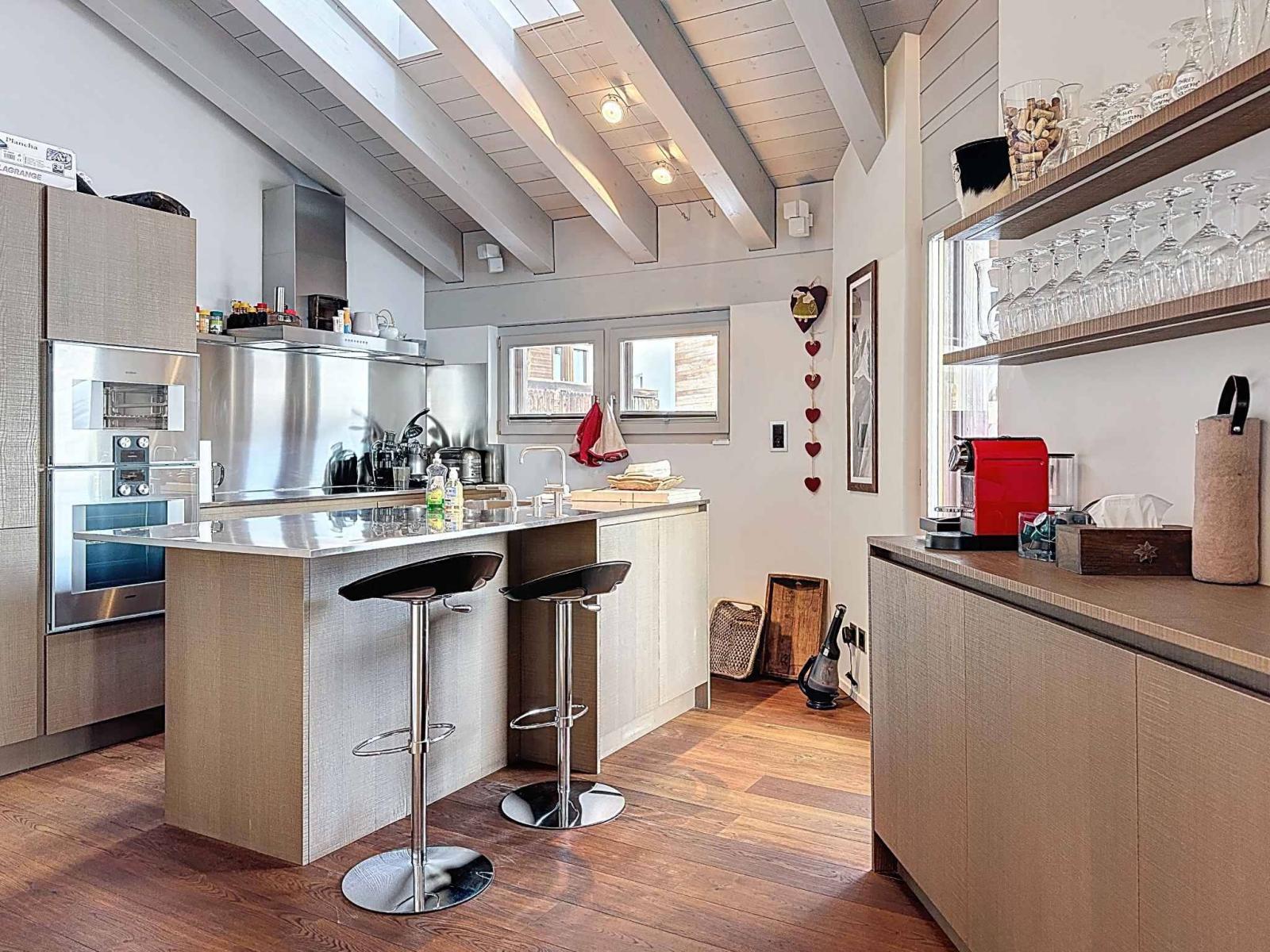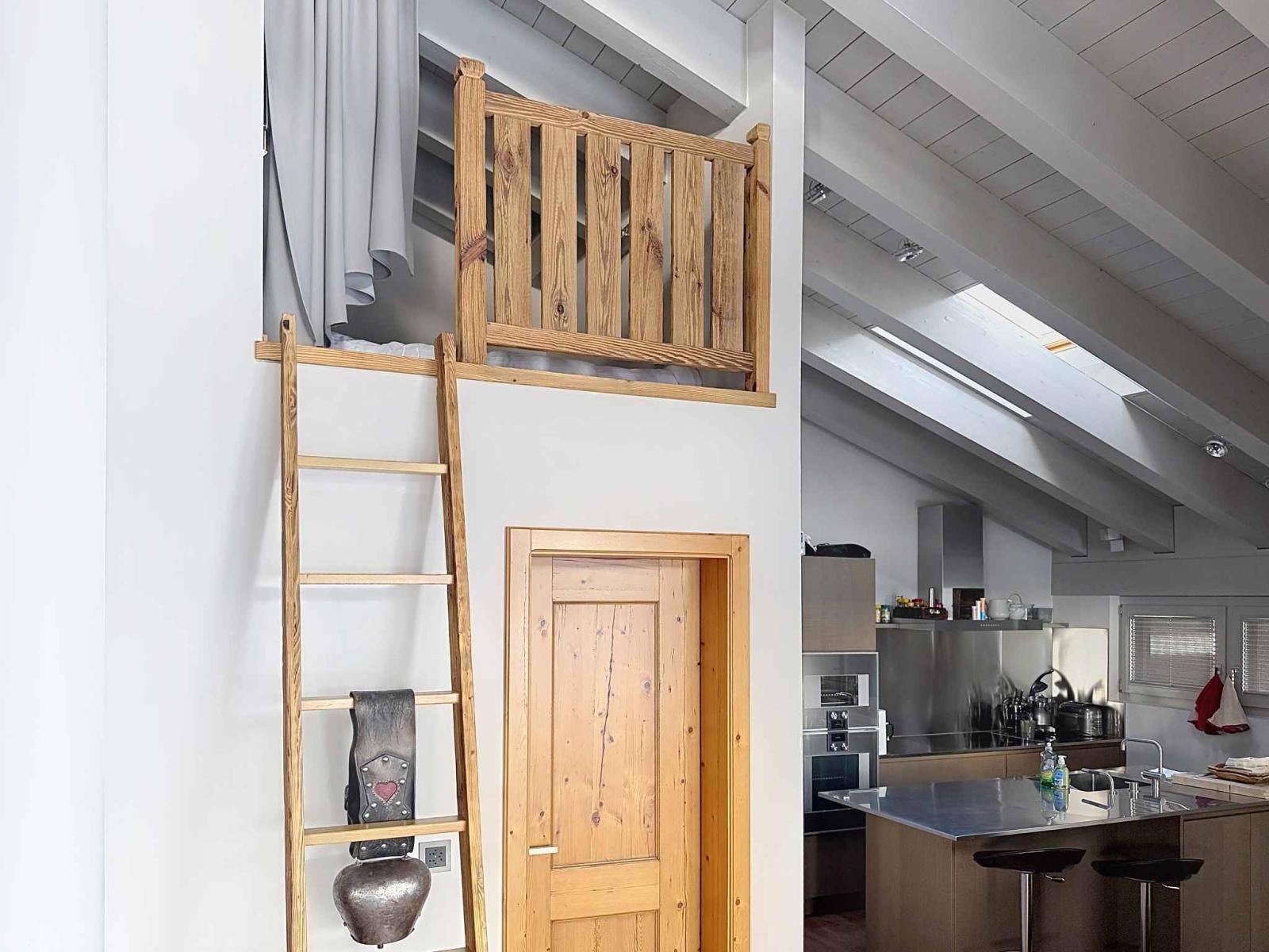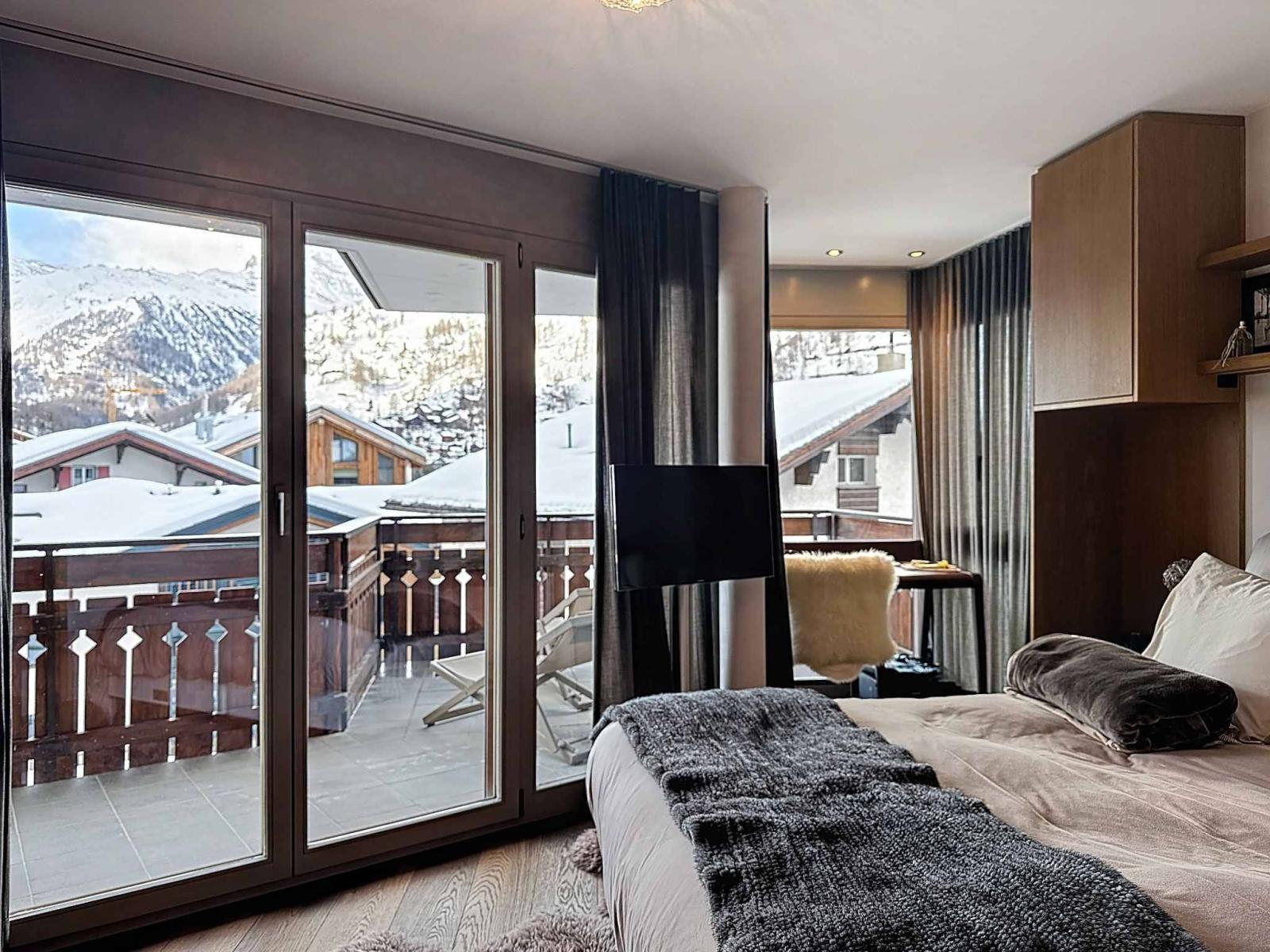 The attic level impresses with a generous living area, high ceilings, and exposed beams. Premium materials and finishes (dark parquet floors, reclaimed wood fireplace) create a chic alpine atmosphere. Direct access to a large sunny balcony with panoramic Matterhorn views.