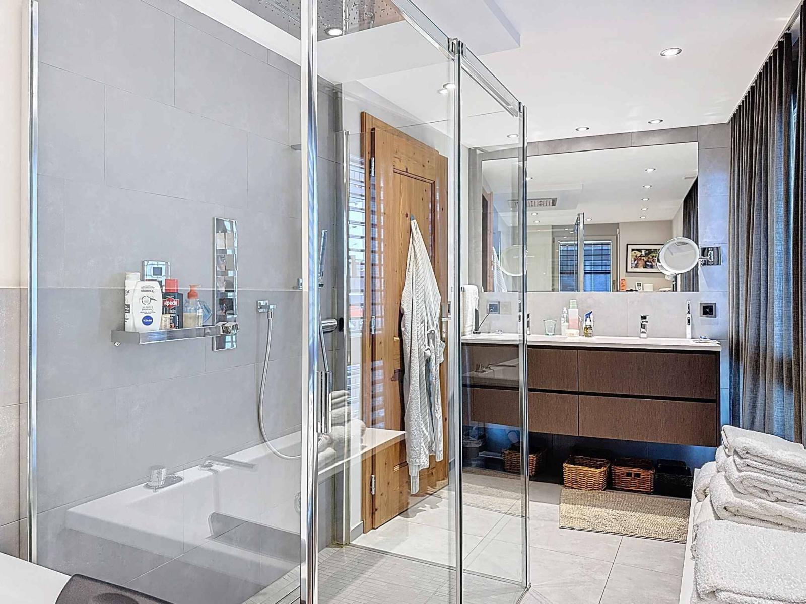 The lower floor features three spacious bedrooms, all with Matterhorn views, including a master suite with a private balcony. Two bathrooms complete this level: a large bathroom with rain shower and built-in Jacuzzi bathtub in reclaimed wood, and a second bathroom with a shower.