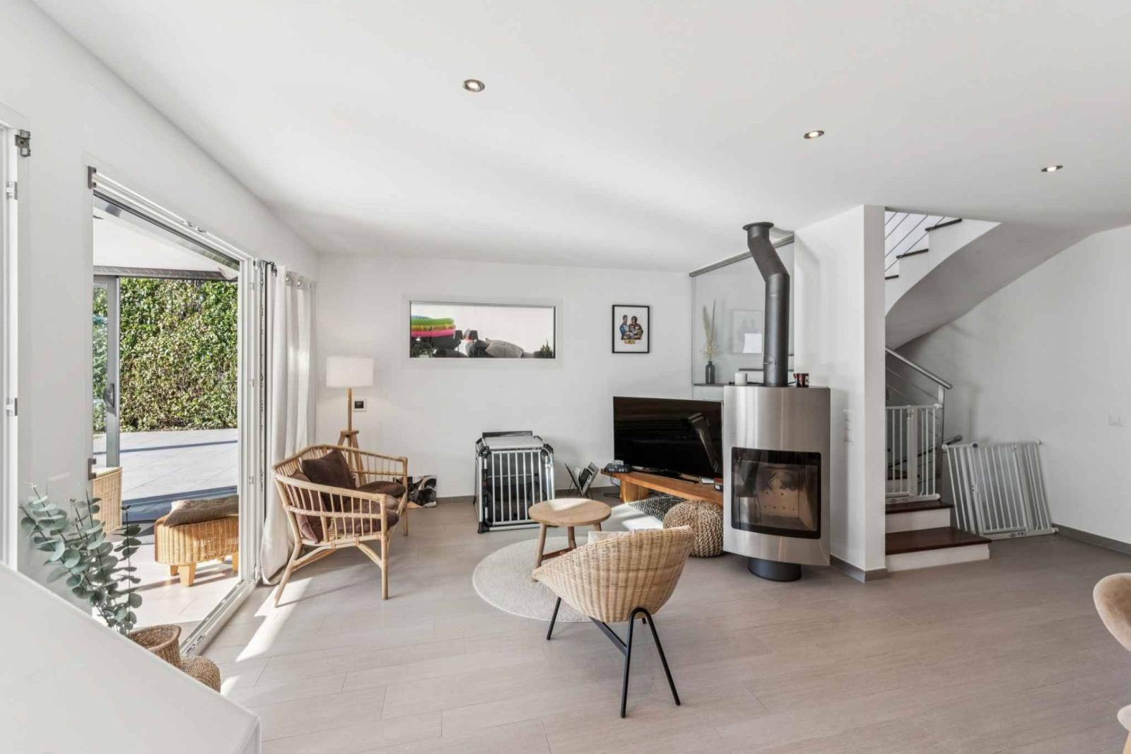 The ground floor comprises an entrance hall, a guest WC with built-in wardrobes, and a large living room with an open-plan kitchen and dining area. The living room, with its wood-burning stove, opens onto a superb conservatory with a skylight overlooking the terrace.