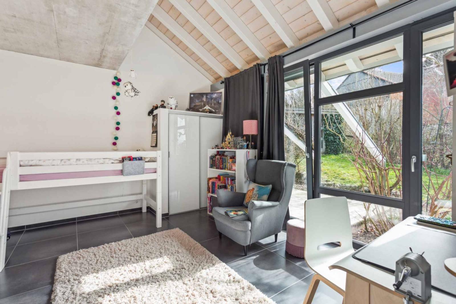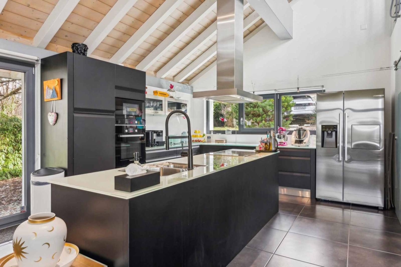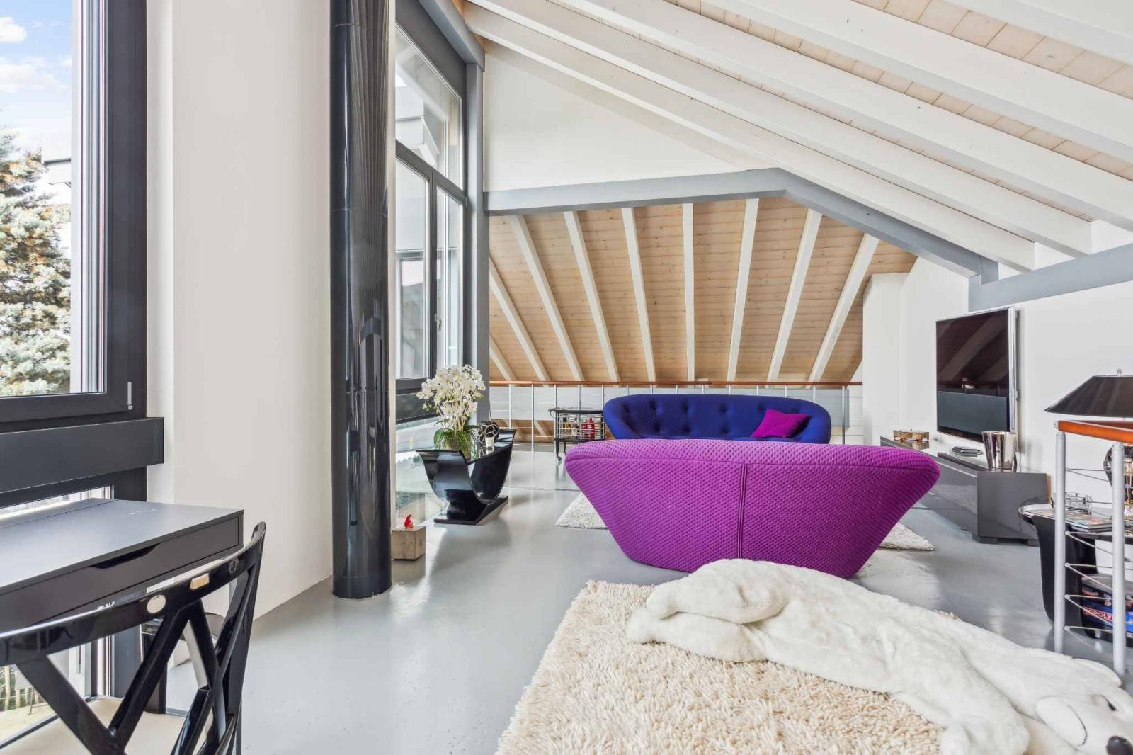 The living spaces include a spacious living room with a dining area and a modern open-plan kitchen that opens directly onto the terraces and garden. The rooms benefit from high ceilings and a seamless flow between the different levels. The layout includes four comfortable bedrooms as well as versatile spaces such as an office or workshop, adaptable to the needs of a family or a home-based business.