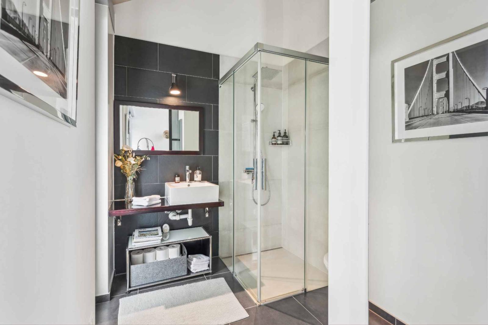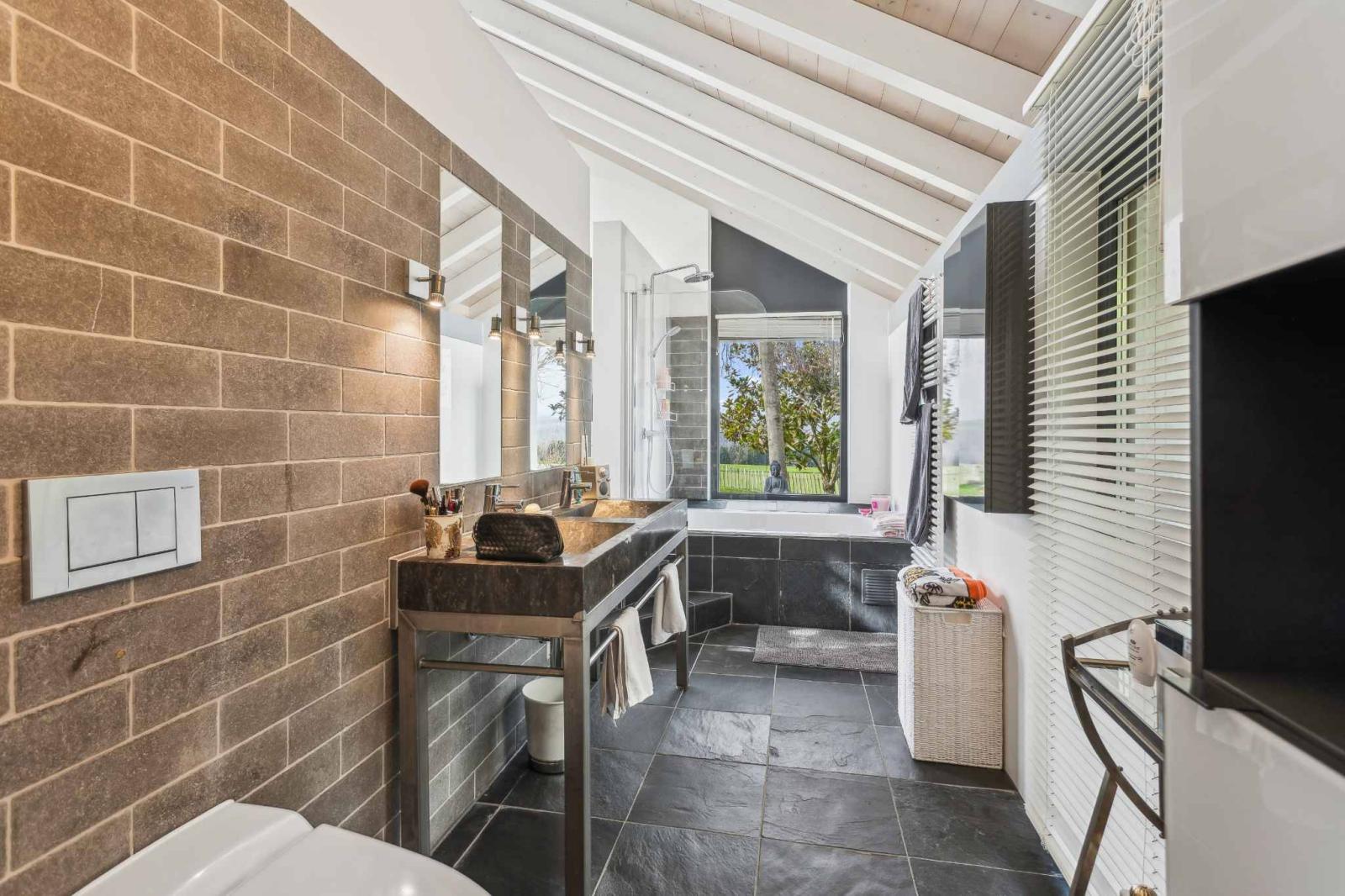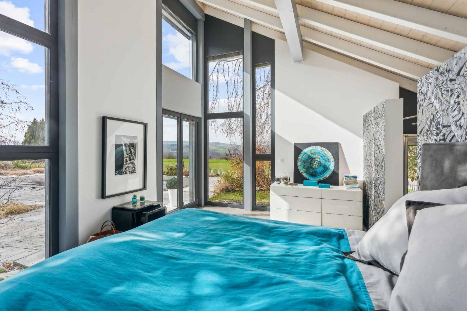 The living spaces include a spacious living room with a dining area and a modern open-plan kitchen that opens directly onto the terraces and garden. The rooms benefit from high ceilings and a seamless flow between the different levels. The layout includes four comfortable bedrooms as well as versatile spaces such as an office or workshop, adaptable to the needs of a family or a home-based business.