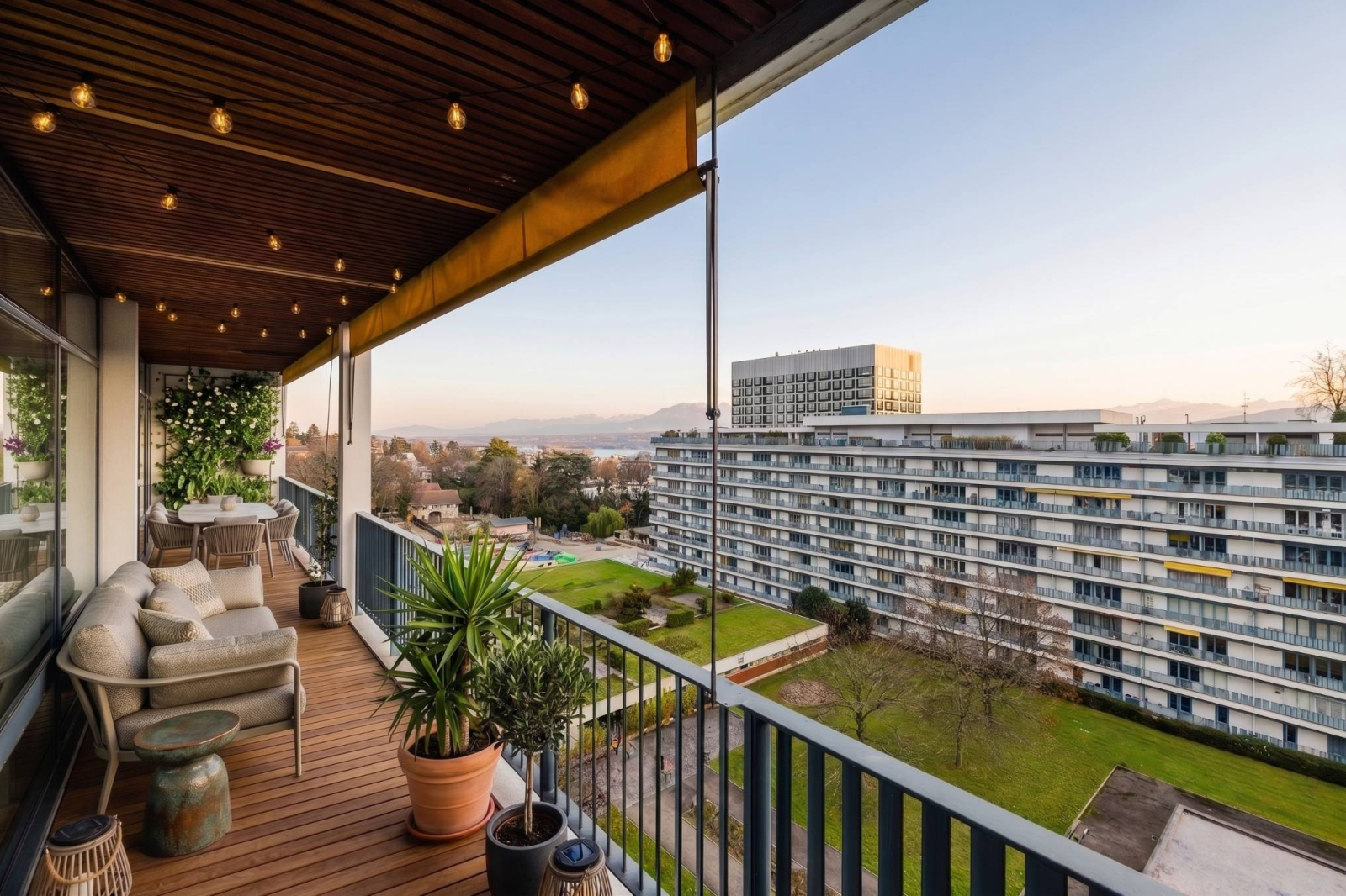 Bright, airy and occupying the entire floor, the apartment enjoys a partial view of the Alps, the lake and the Jura mountains.