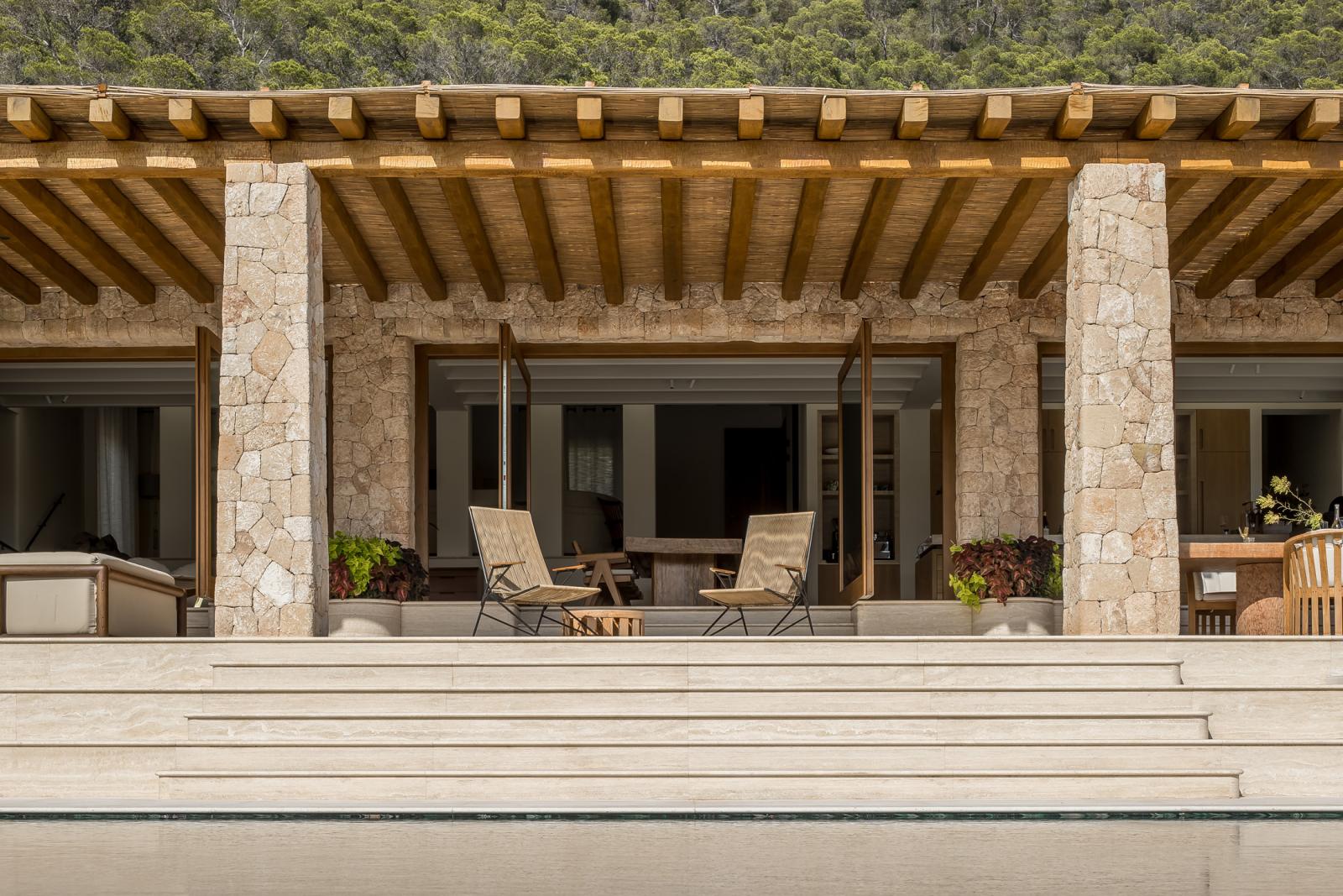 Can Brute is a secluded six-bedroom villa for sale in the hills above Cala Mastella, offering stunning sea views. Designed by Framework Studio, the villa combines traditional Ibicencan architecture with modern luxury and an off-grid energy system, providing a peaceful escape from the outside world. The villa's stone façade blends seamlessly with the landscape, leading to a serene interior of travertine floors, wood accents, and whitewashed walls. The open-plan living area is flooded with natural light, while the bespoke kitchen features marble countertops and Gaggenau appliances. Outdoor spaces include multiple terraces for relaxing or yoga, a heated swimming pool, and a sun-drenched deck perfect for enjoying sunrise views. The principal bedroom suite offers a private terrace with views of the surrounding landscape, while four additional bedrooms are thoughtfully designed for comfort and privacy. With two more bedrooms on the lower ground floor, as well as an underground garage and ample storage, Can Brute is the ultimate island retreat.