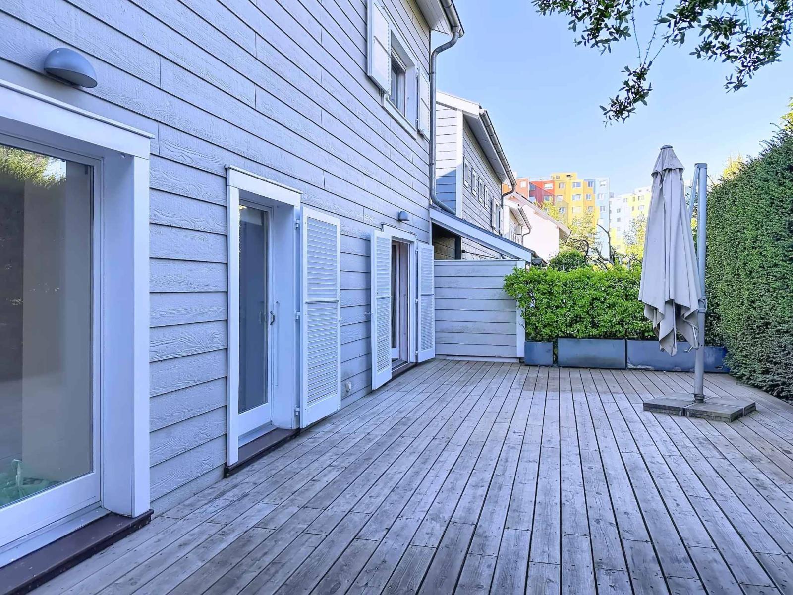 Located in a pleasant villa district, this semi-detached house (attached by the garage) benefits from proximity to all public transport (bus, tram, train station and airport) and all amenities.