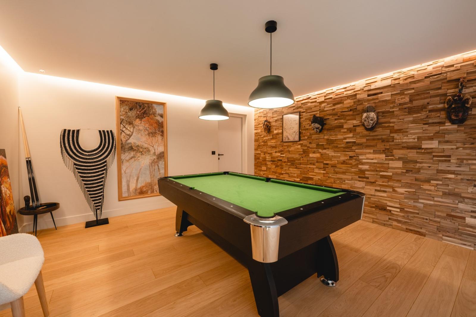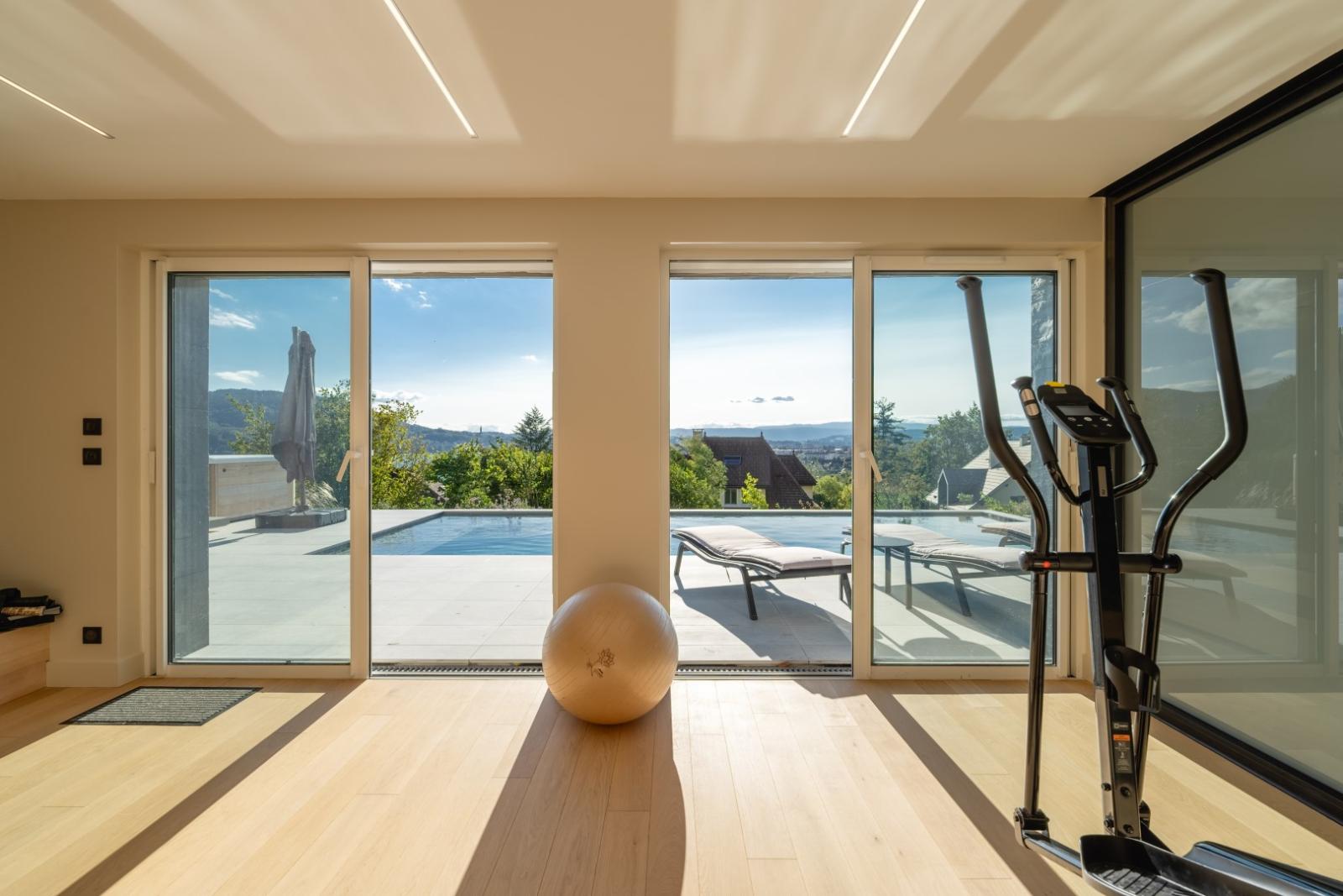 Inside, the villa spans over 300 m² and includes 4 bedrooms, two of which are master suites with walk-in closets, a fitness room, a sauna, a climate-controlled wine cellar, and a billiard room.