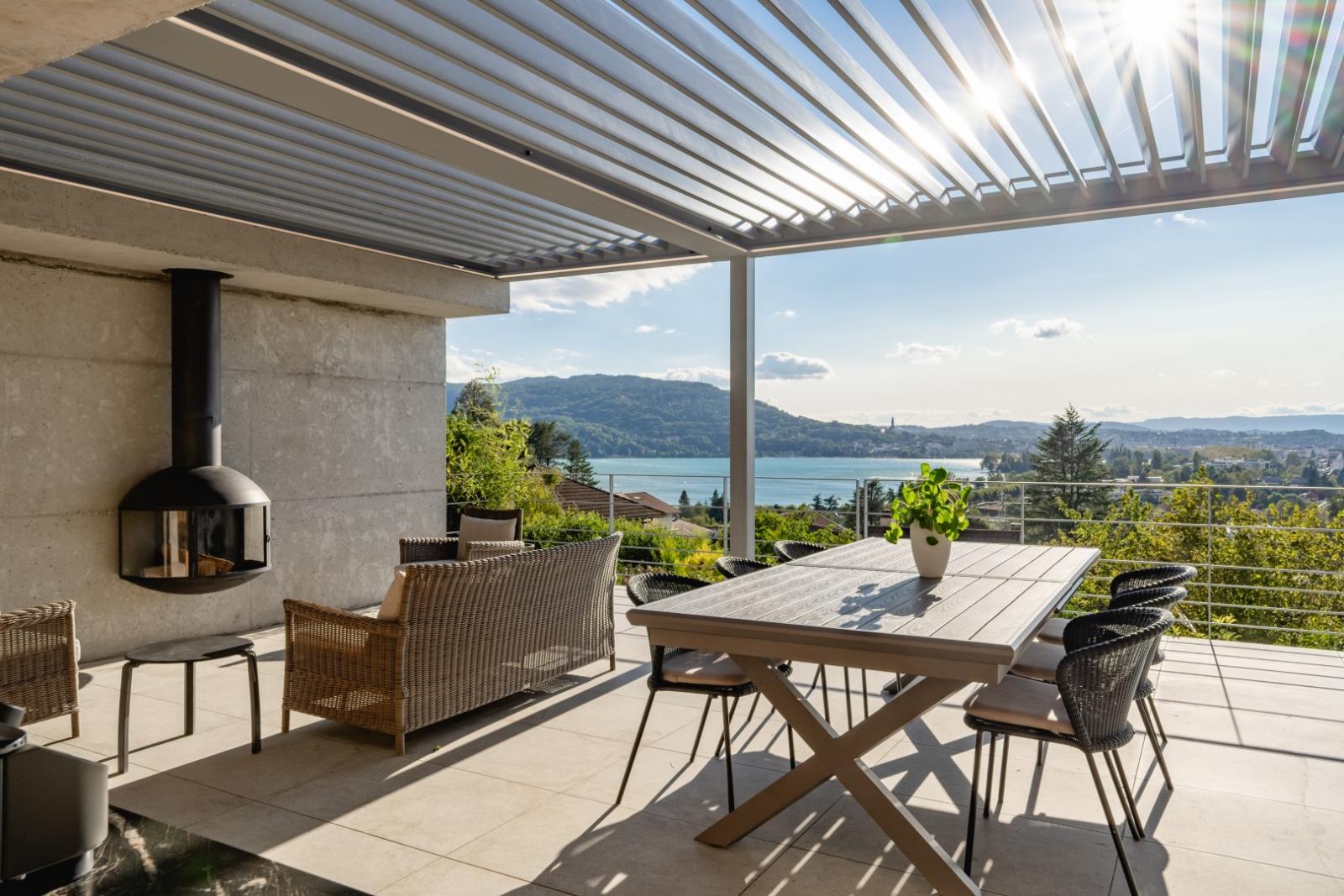 The adjoining covered terrace offers a welcoming outdoor living area, featuring a summer kitchen and a wood stove.