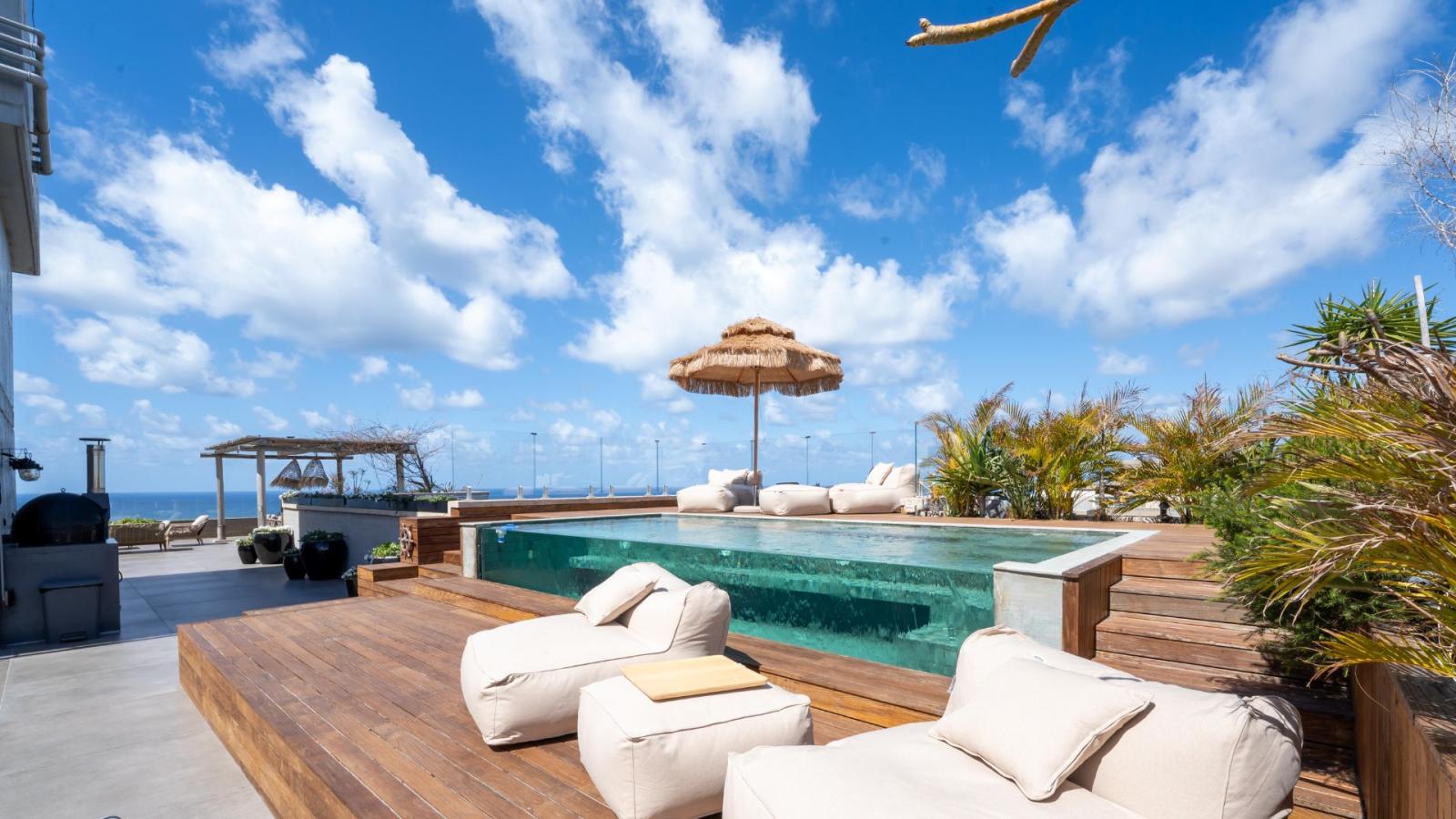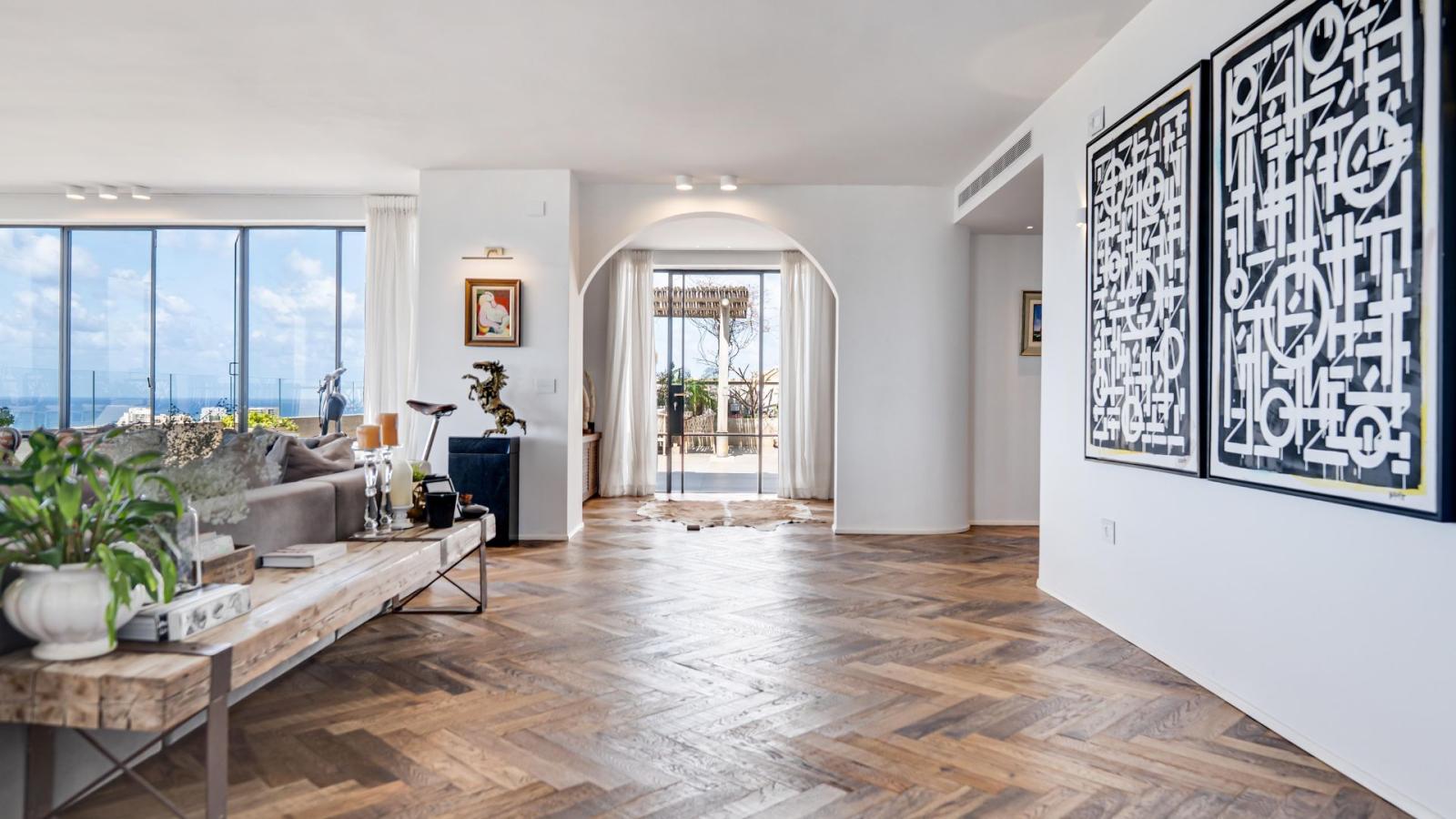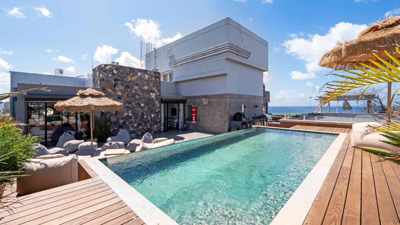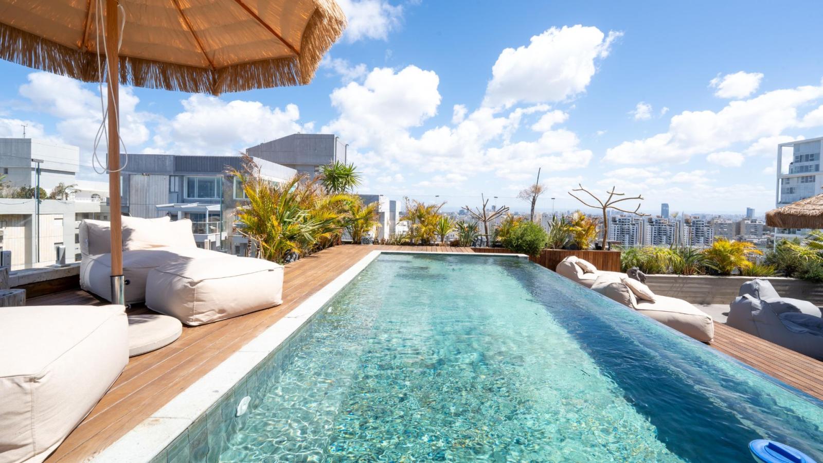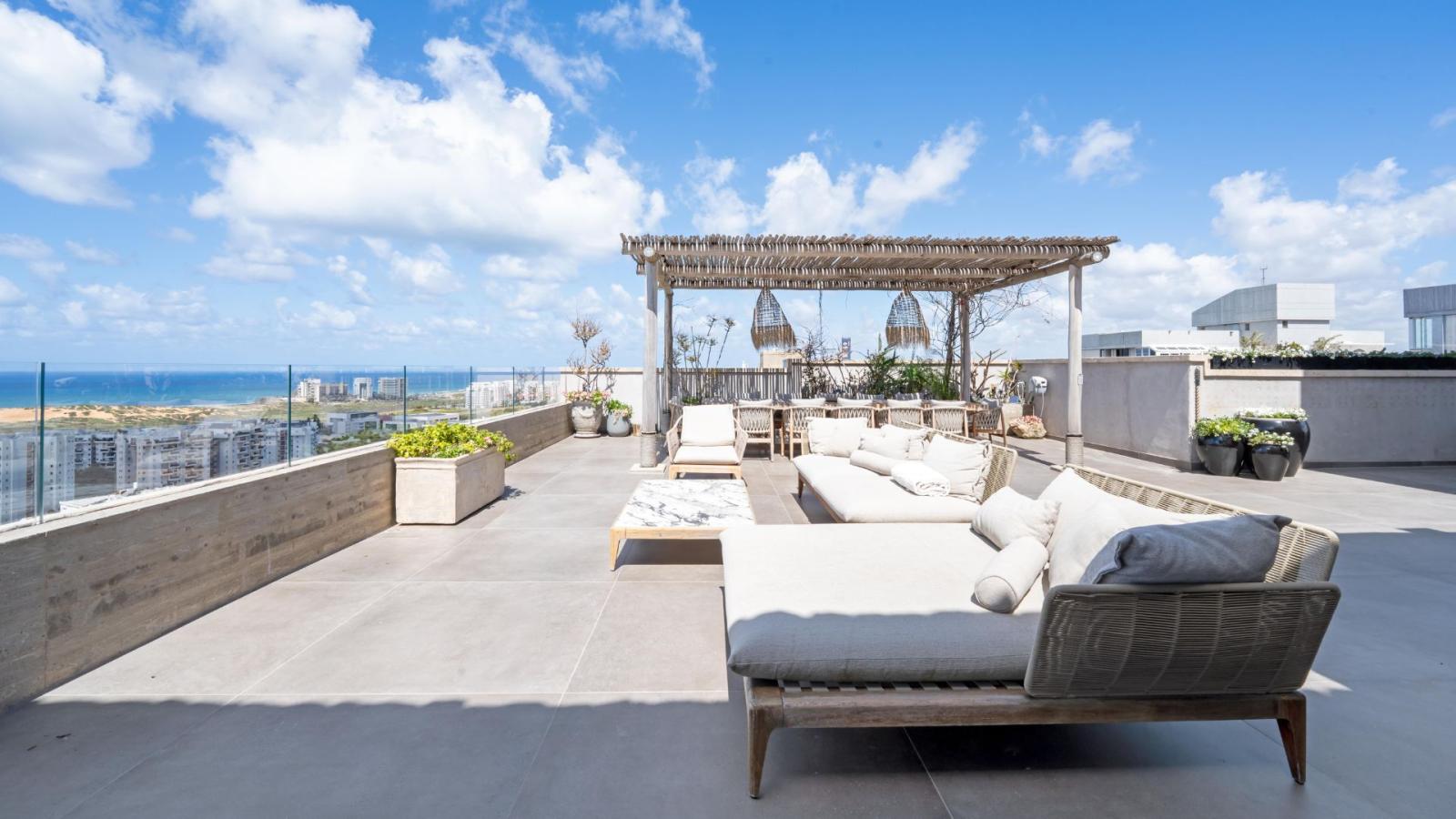 In the prestigious Ramat Aviv neighborhood, an exceptional and exclusive penthouse is offered for sale – the sole residence on its floor, featuring a private entrance. Spanning 290 sqm of intelligently designed interior space, the penthouse includes five bedrooms, two of which are luxurious master suites, and an expansive 300 sqm terrace with a private swimming pool and breathtaking open views of the sea. This rare property enjoys four exposures, three private parking spaces, and a premium technical specification: a fully equipped kitchen with state-of-the-art appliances, an outdoor kitchen with a wood-fired oven, refrigerator, barbecue, and more. It also boasts advanced air conditioning and sound systems, as well as a smart home system operated via smartphone. The penthouse is offered fully furnished with high-end designer pieces from leading brands, finished to the highest standard