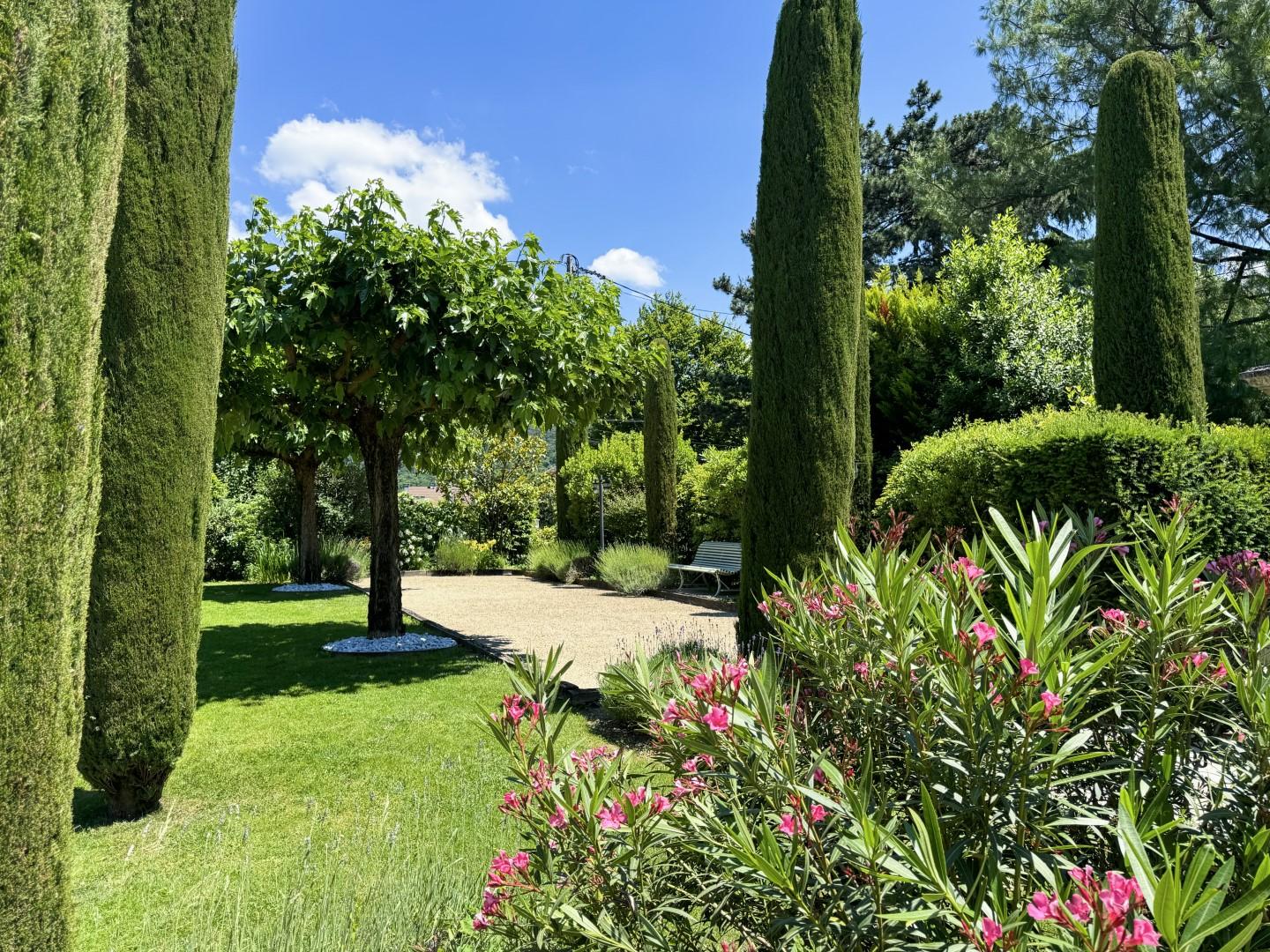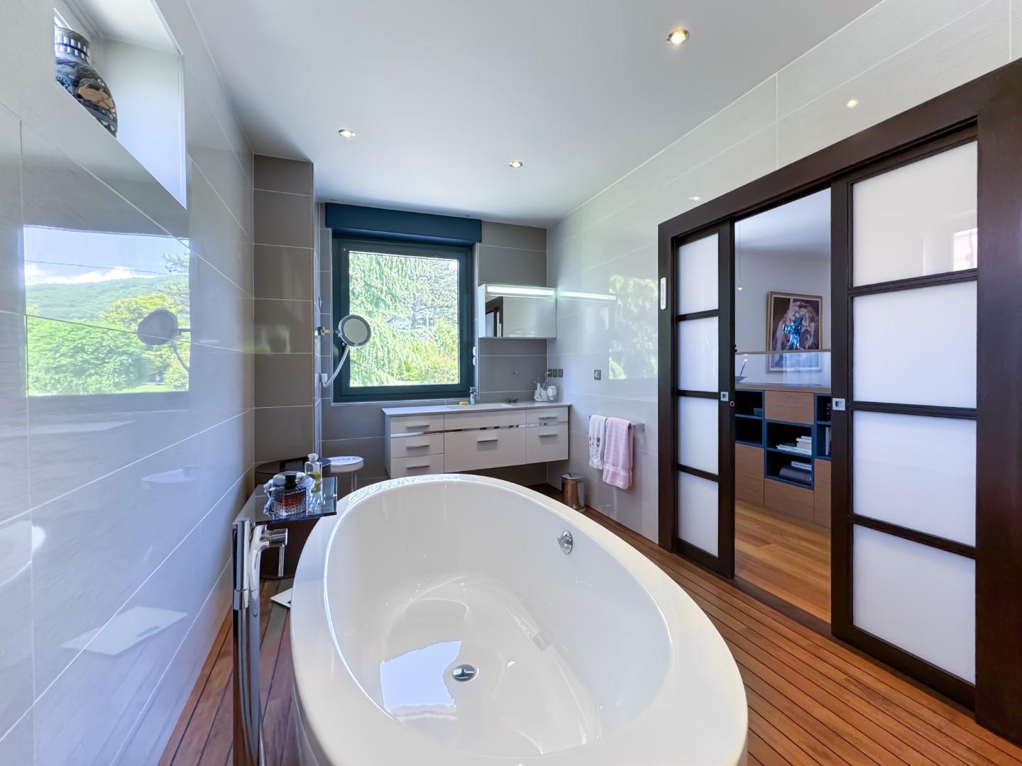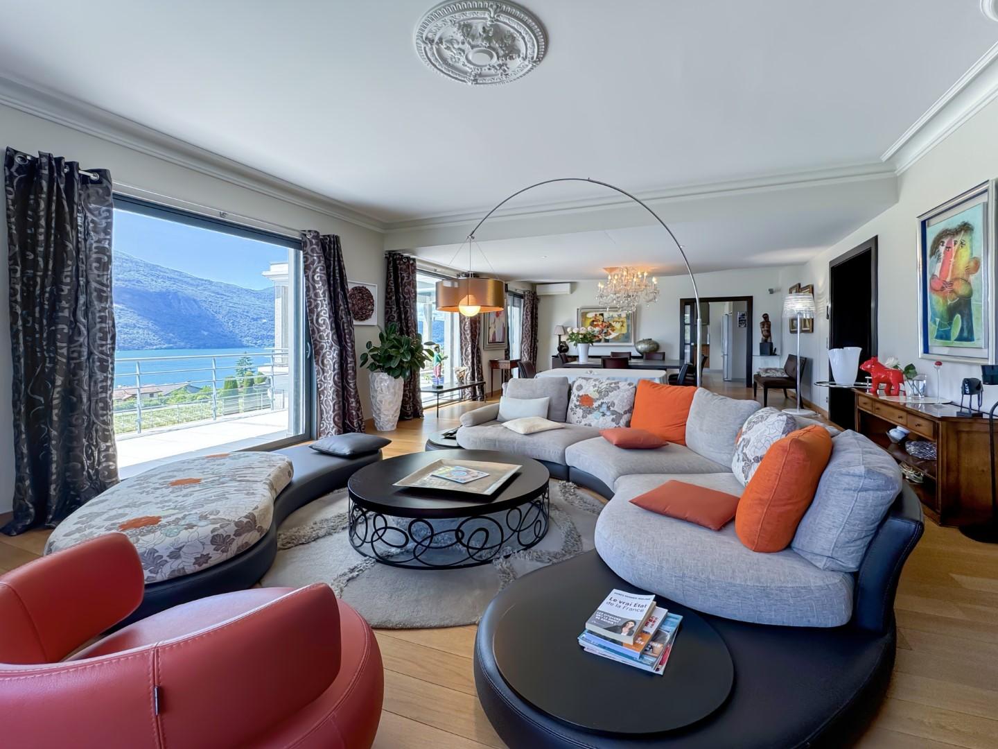 Nichée sur la commune prisée de Brison-Saint-Innocent, cette somptueuse propriété de 500 m² offre un cadre de vie idyllique avec une vue imprenable sur le lac du Bourget et les montagnes environnantes. Entièrement rénovée en 2006, elle allie élégance, confort et prestations haut de gamme, le tout dans un environnement paisible et préservé. Dès l’entrée, vous serez séduit par ses volumes généreux et sa luminosité exceptionnelle. Le rez-de-chaussée propose un vaste séjour de plus de 60 m² s’ouvrant sur une immense terrasse avec panorama sur le lac, une cuisine indépendante, un bureau ainsi qu’une somptueuse suite parentale avec dressing et salle de bains. L’étage accueille deux grandes chambres en suite avec accès à une terrasse, un dortoir avec sa propre salle de bains et un espace dressing. Le rez-de-jardin, pensé pour la détente et la convivialité, dispose d’une cuisine d’été avec séjour, d’une salle de billard et d’un espace fitness avec salle d’eau. L’ensemble s’ouvre sur une terrasse agrémentée d’une piscine chauffée de 5 x 10 m, véritable havre de bien-être face au lac. Le parc paysager de plus de 2 500 m², entièrement clos, invite à la sérénité avec ses différents espaces de détente soigneusement aménagés. Un garage pour deux voitures, un grand sous-sol, un local technique sous la piscine de plus de 100 m² et un garage à vélo viennent parfaire cette propriété unique. Idéalement située à seulement quelques minutes d’Aix-les-Bains, cette demeure d’exception offre un cadre de vie rare, entre nature préservée et proximité des commodités.