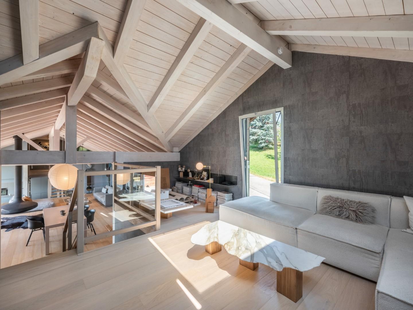 The cathedral-style living room impresses with its soaring volumes and extends to a 60 m² open-air terrace.