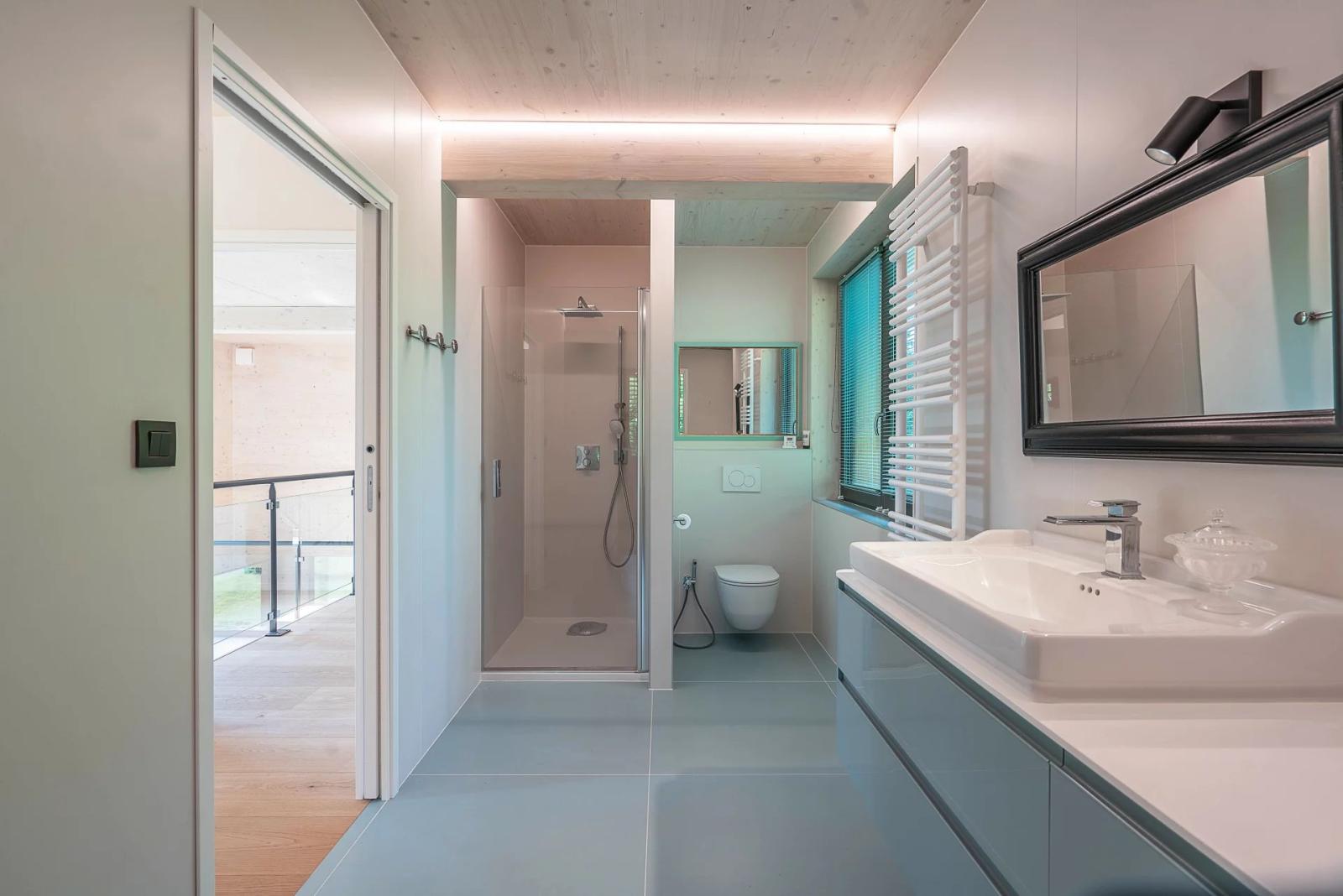 Built on a full basement, this residence consists of two distinct wings, offering comfort, privacy, and functionality. It boasts high-end finishes, elegantly combining metal, glass, and travertine marble.