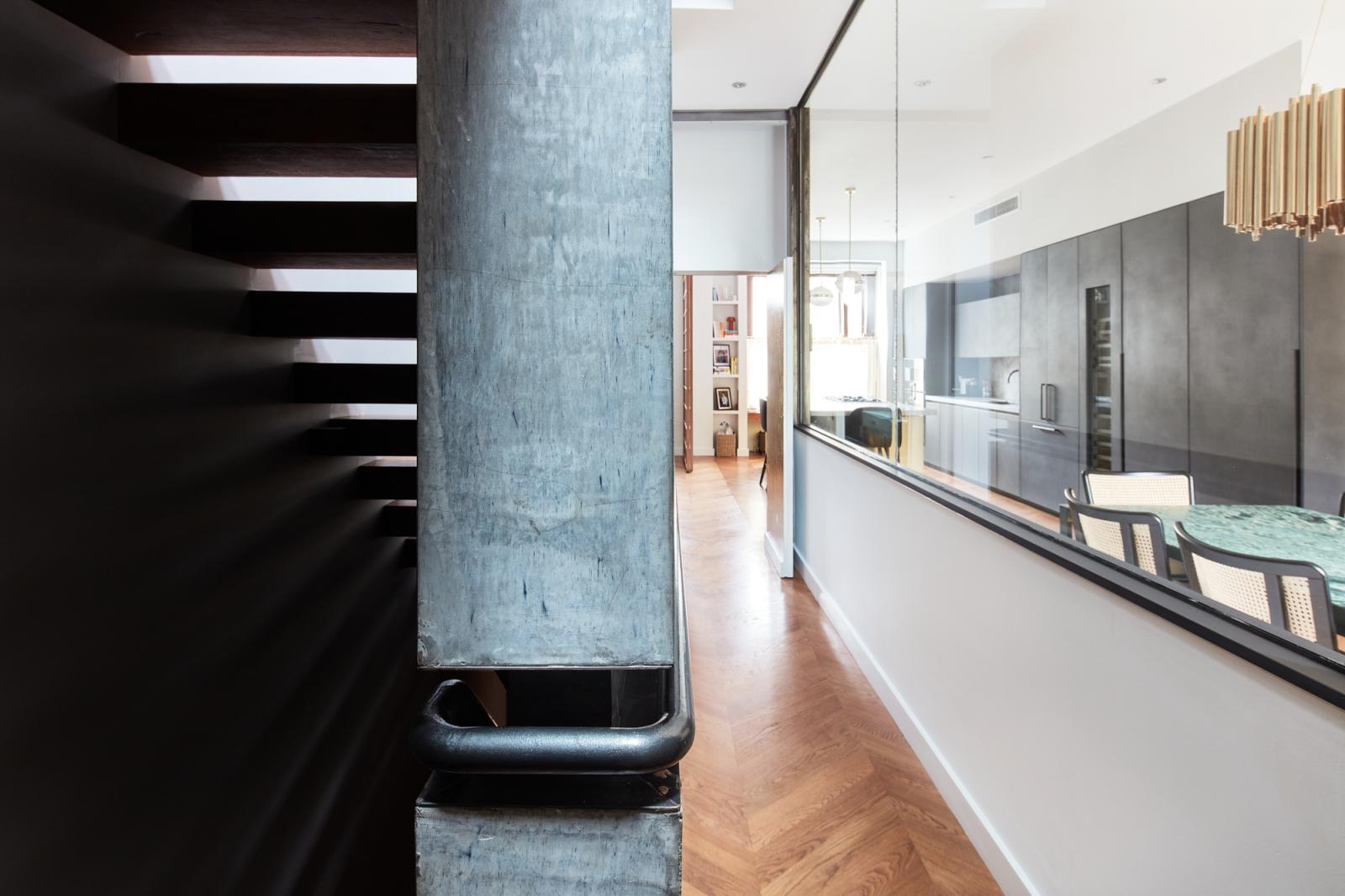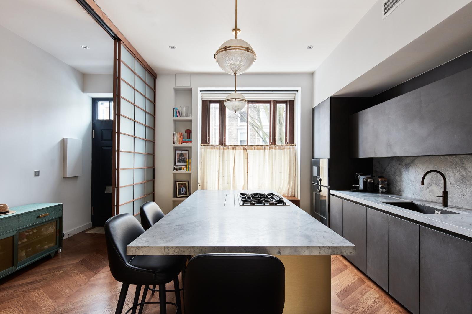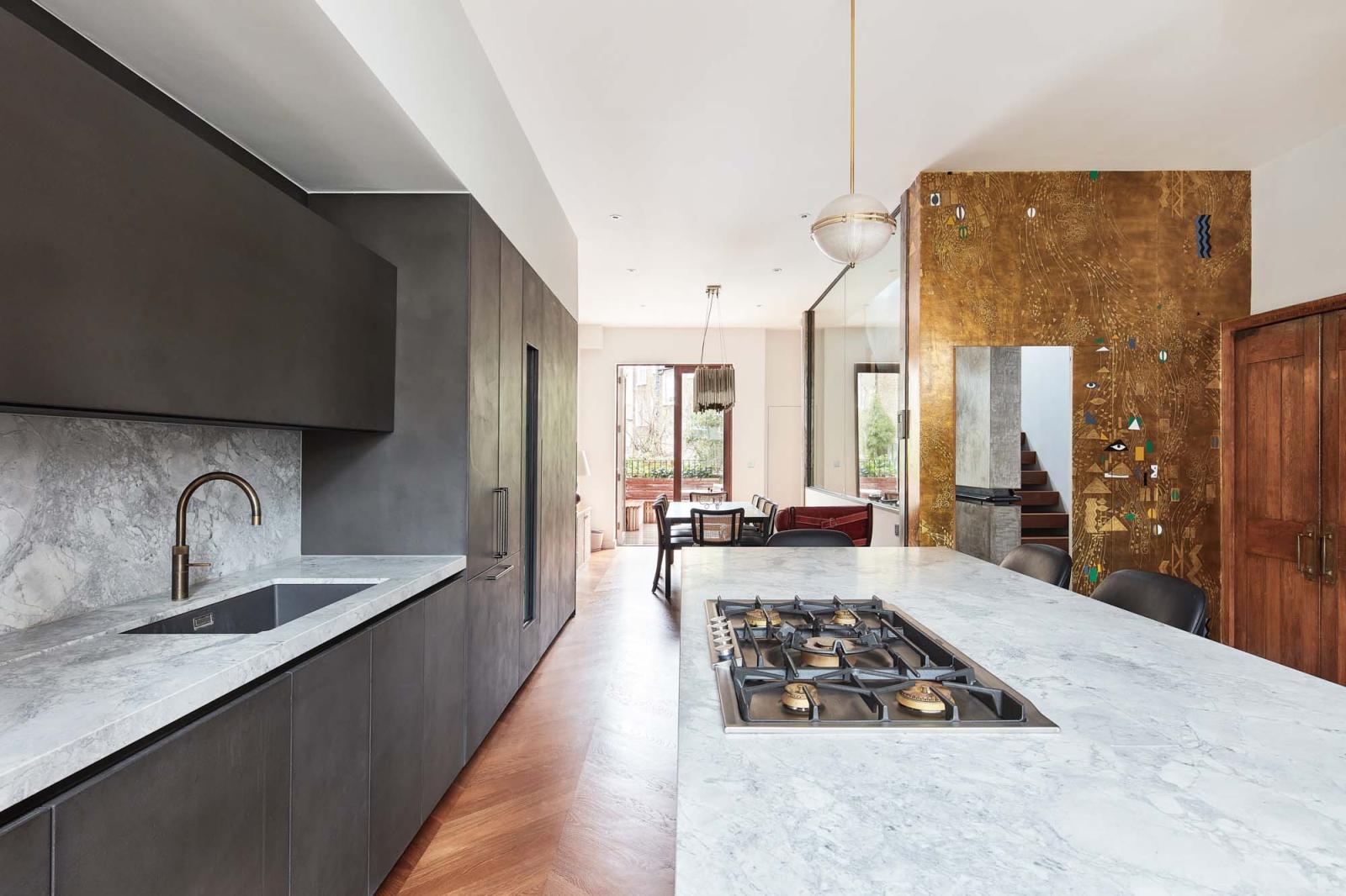 The open-plan kitchen and dining room, accessed through a sliding screen, showcases a gold-topped island with grey stone, and Gaggenau appliances integrated into minimalistic charcoal cabinetry.