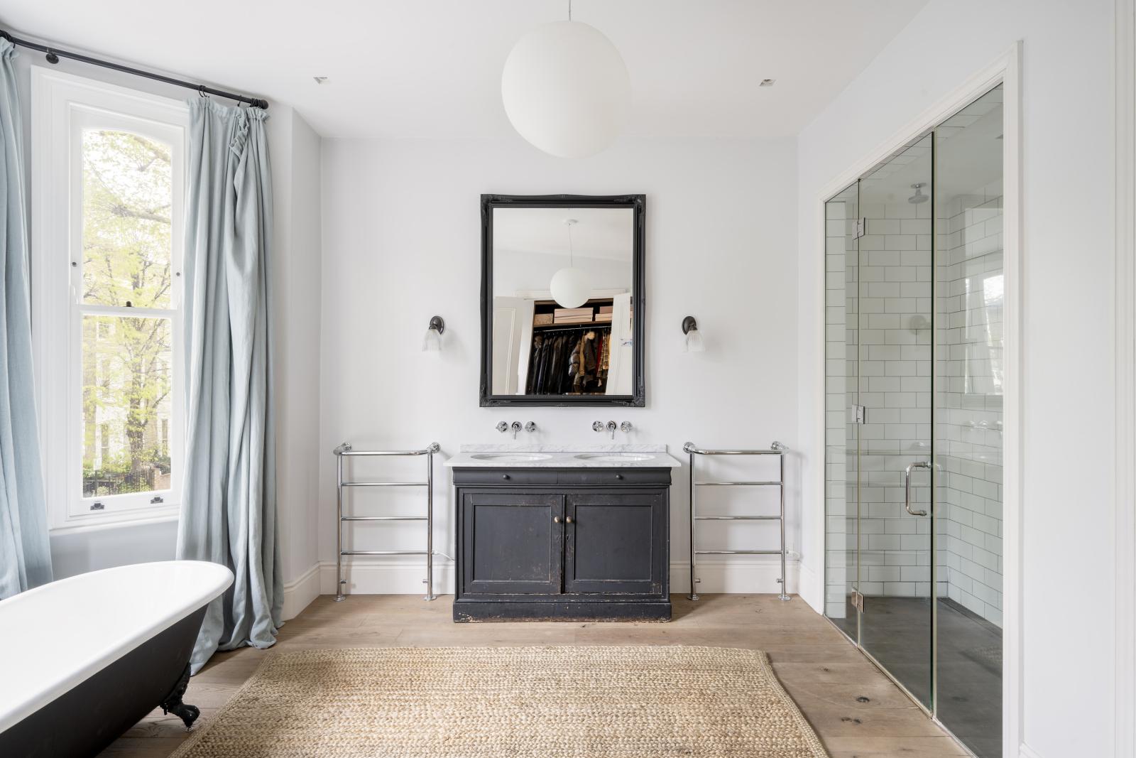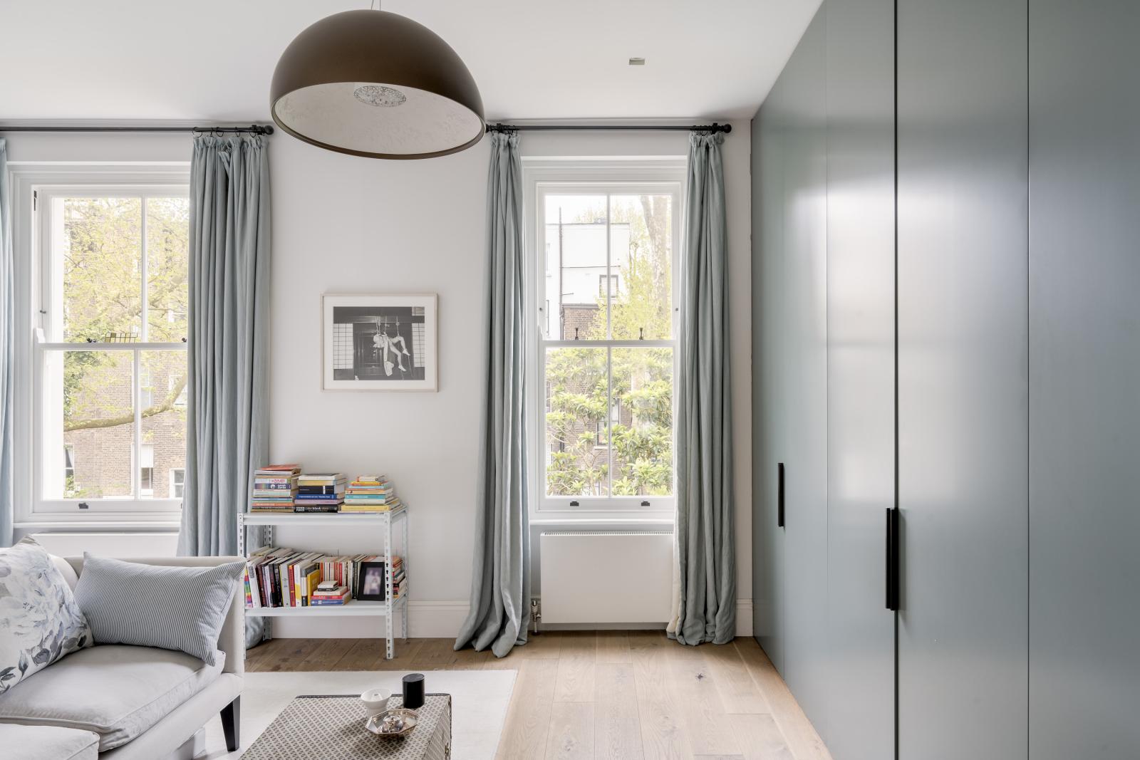 The kitchen is a refined mix of grey cabinetry and integrated Siemens appliances, while Juliet balconies open to create a connection between indoor and outdoor living.