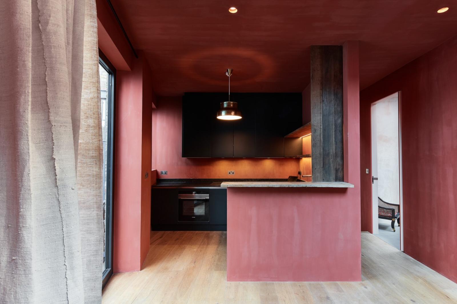 Painted brick walls, old oak cabinets and engineered oak floors with underfloor heating enhance the sense of space.