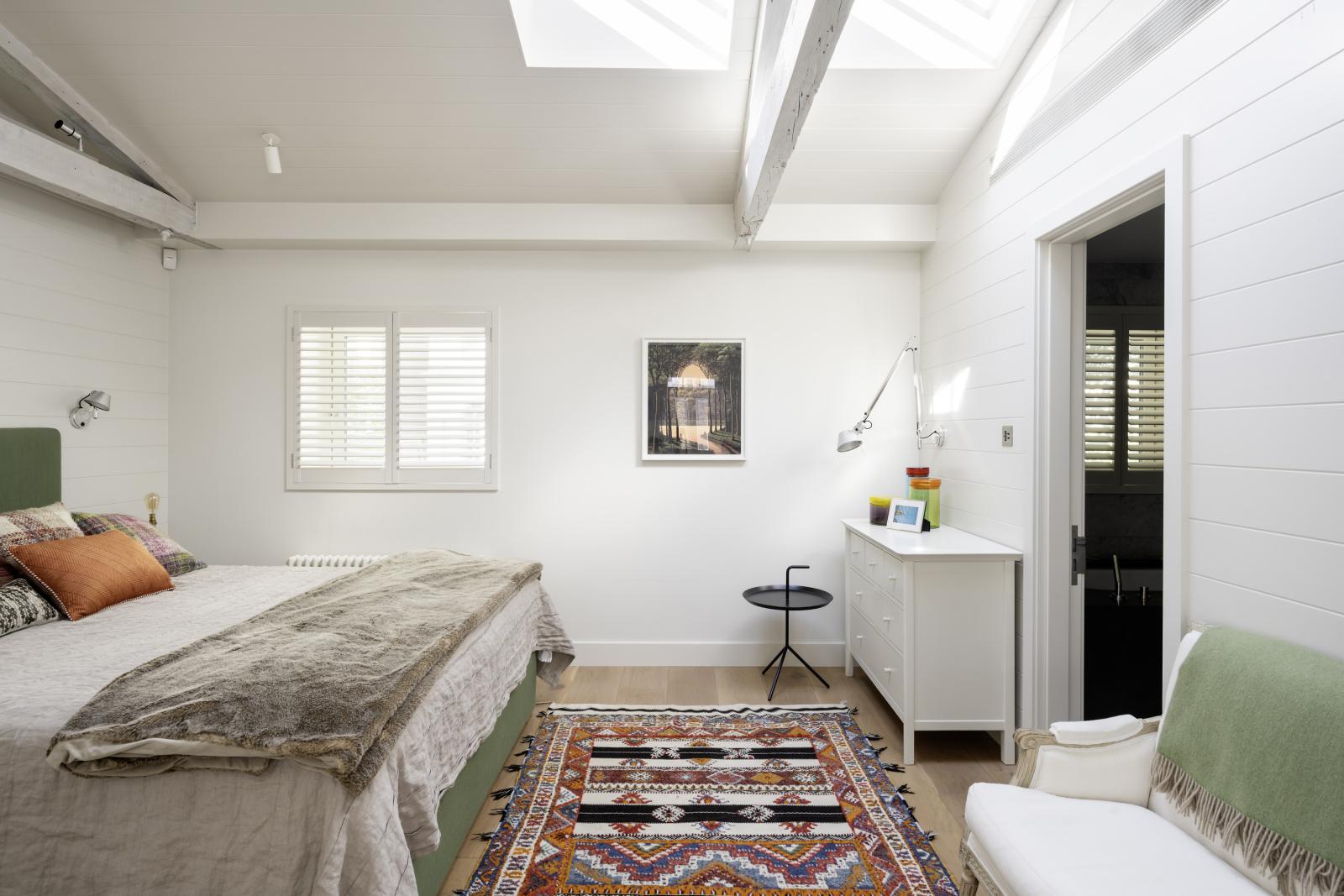 The top-floor principal bedroom features soaring ceilings and heritage skylights, with en suite marble-tiled bathrooms, including a Kaldewei bathtub and separate rainfall shower.