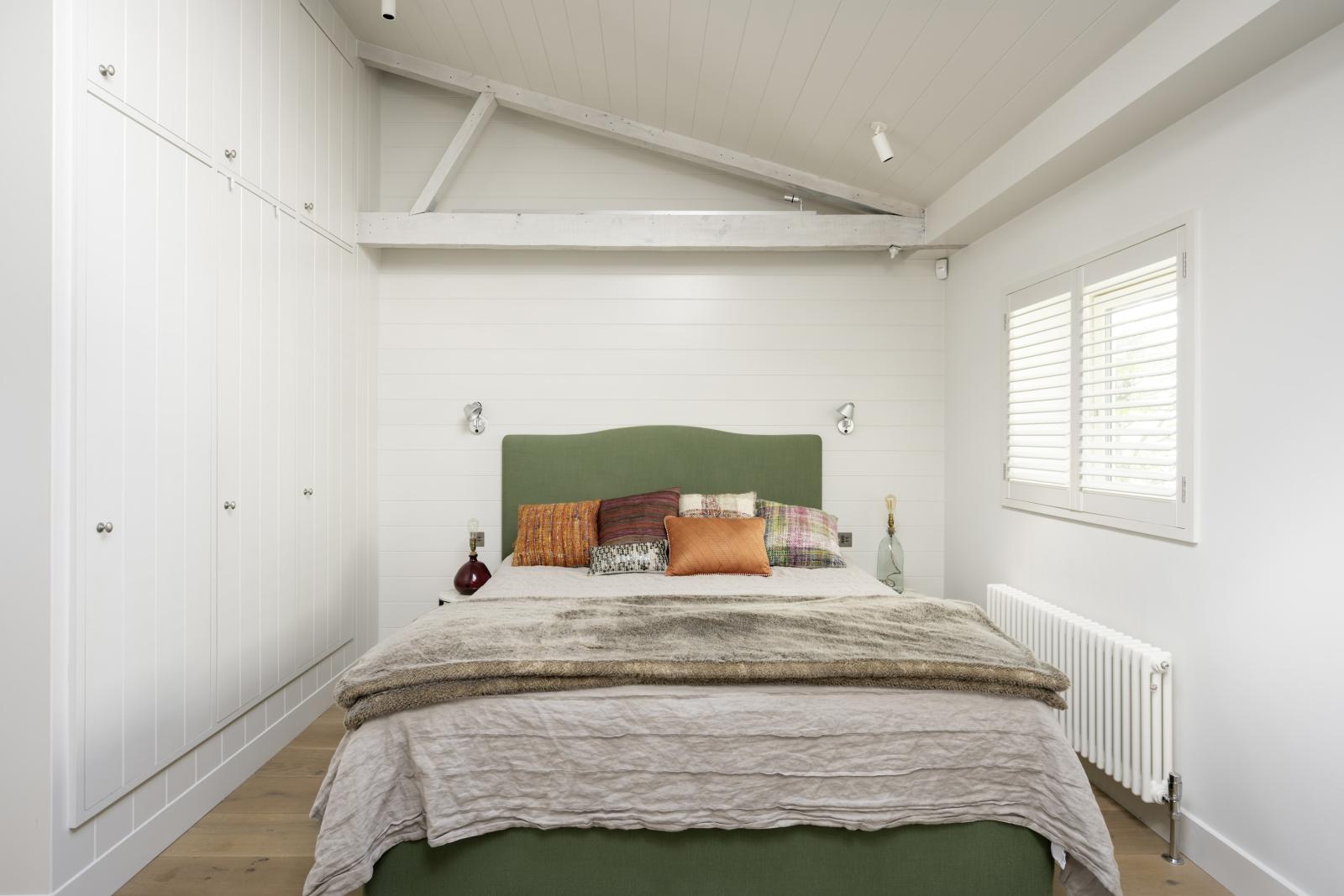 A guest bedroom on the ground floor offers bespoke cabinetry and an en suite with a Dorn Bracht shower.