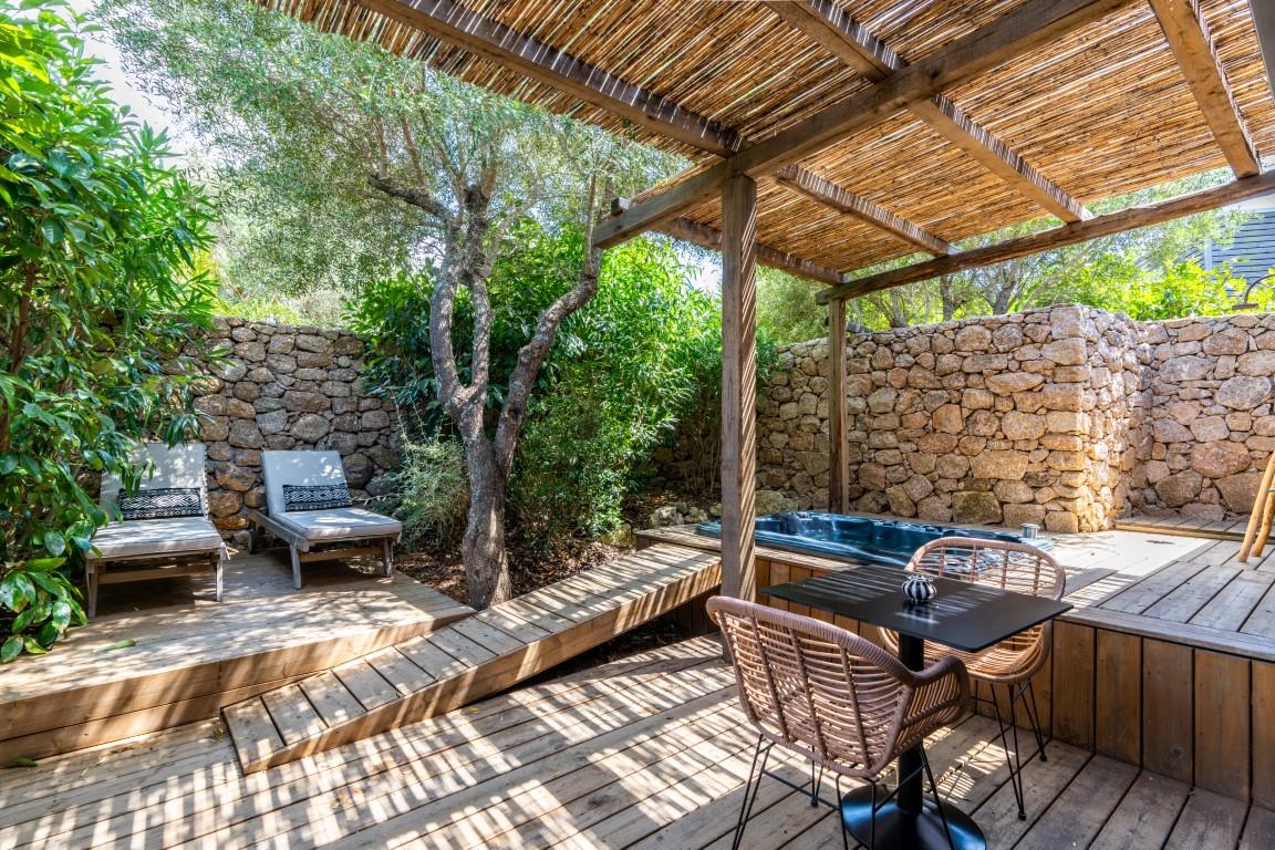 Chacune dispose de sa propre terrasse privative, d’un coin jardin paysager et d’un jacuzzi, dans une atmosphère sereine et confidentielle.