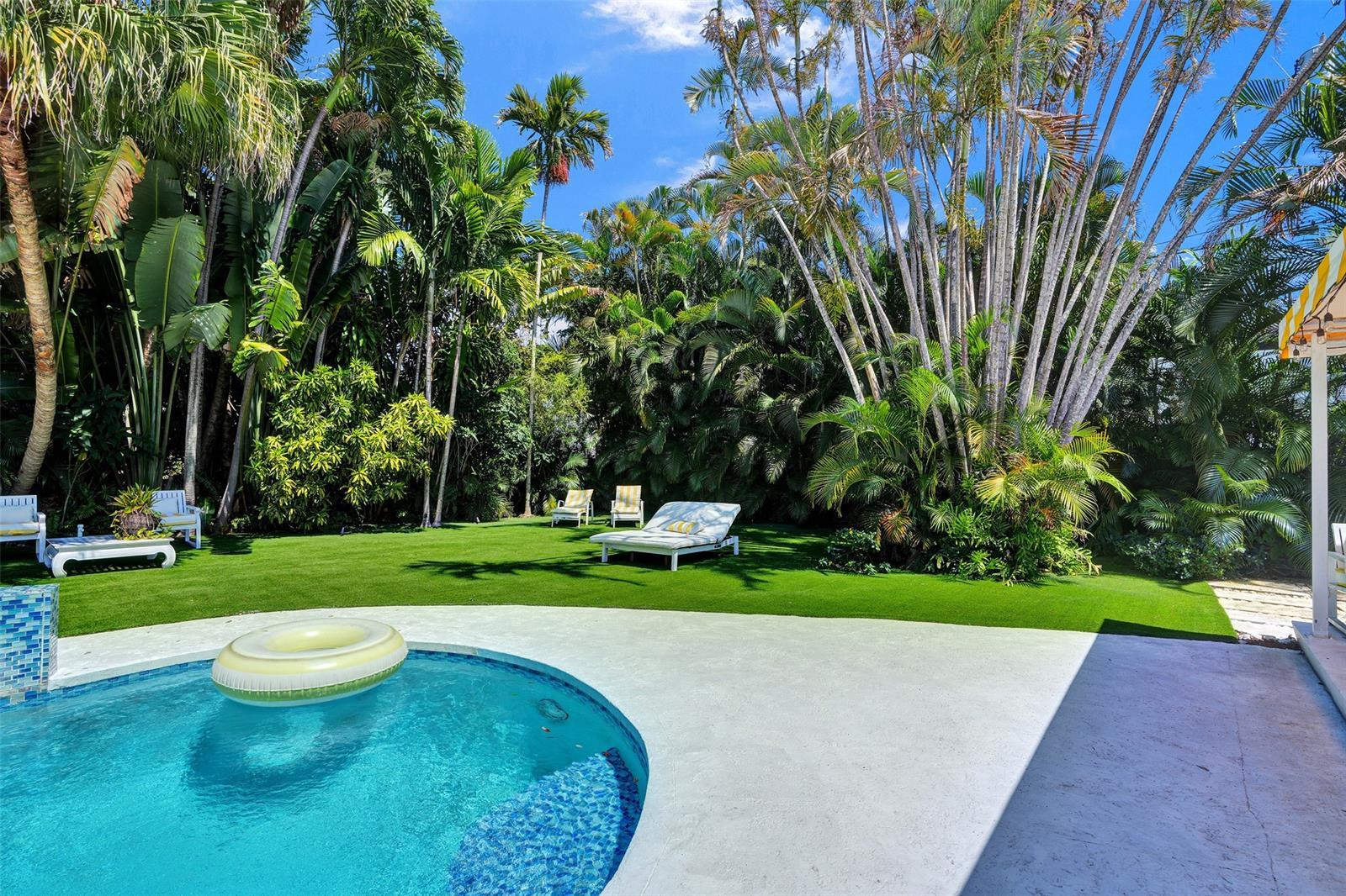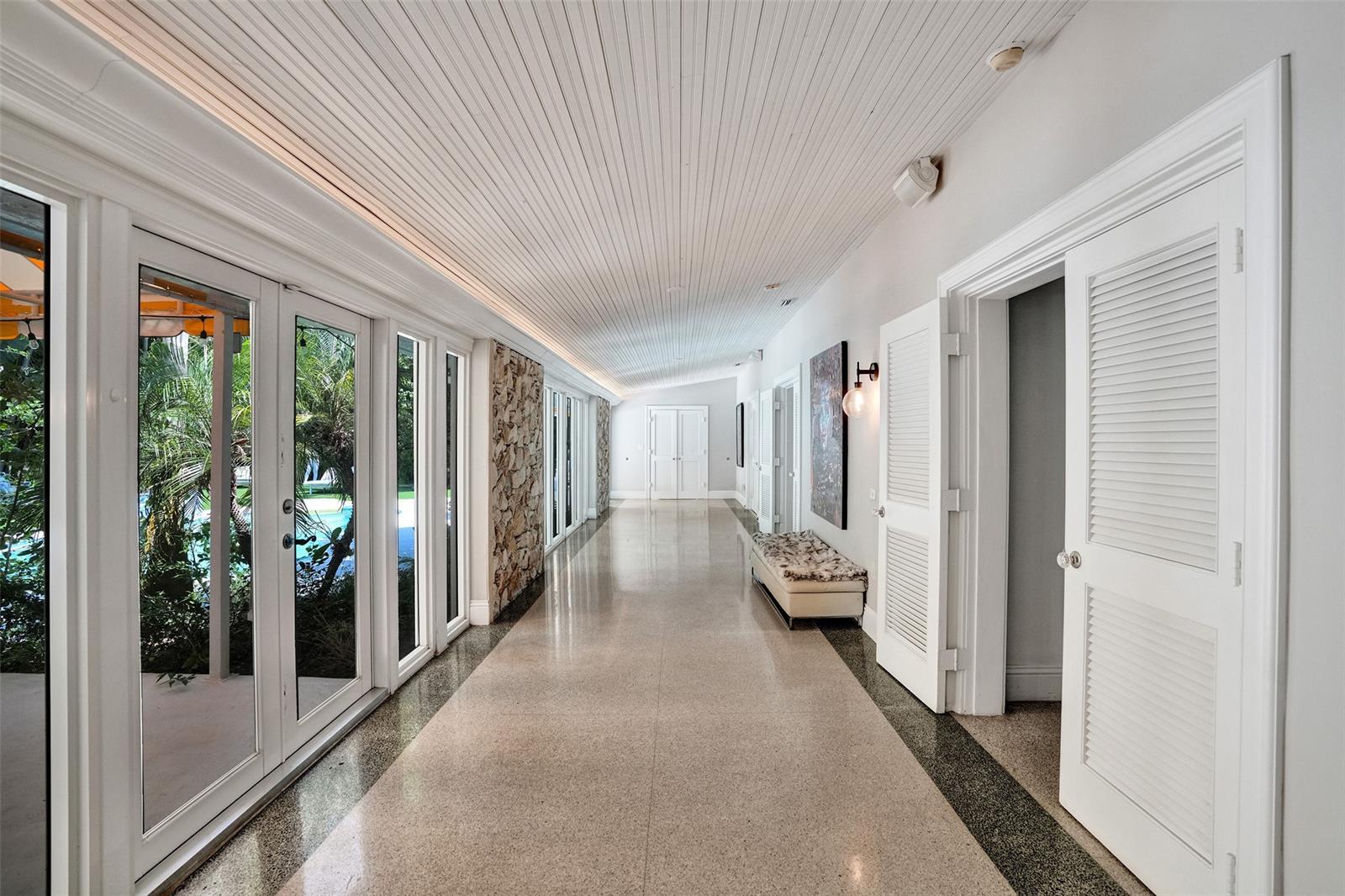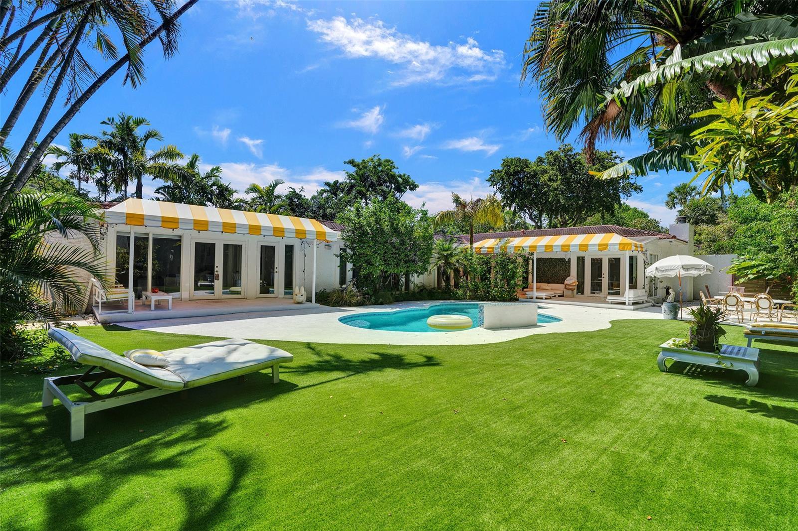 Fully renovated yet rich in original character, with floor-to-ceiling windows, terrazzo floors, a marble dining salon, and a heated saltwater pool framed by iconic yellow awnings.
