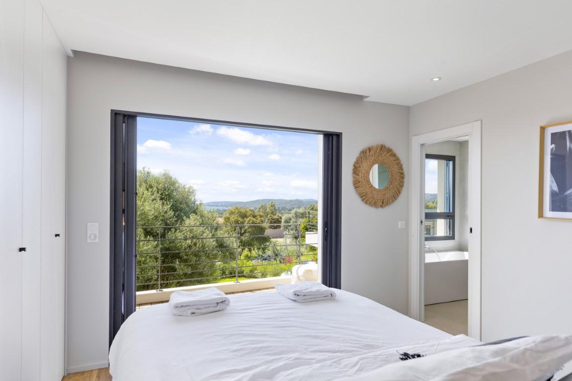 La partie nuit comprend 4 chambres avec salles de bains ou douche, dont une suite parentale avec dressing et terrasse privative offrant une vue panoramique sur le golfe de Saint Cyprien, ainsi qu’un dortoir avec salle de jeux.