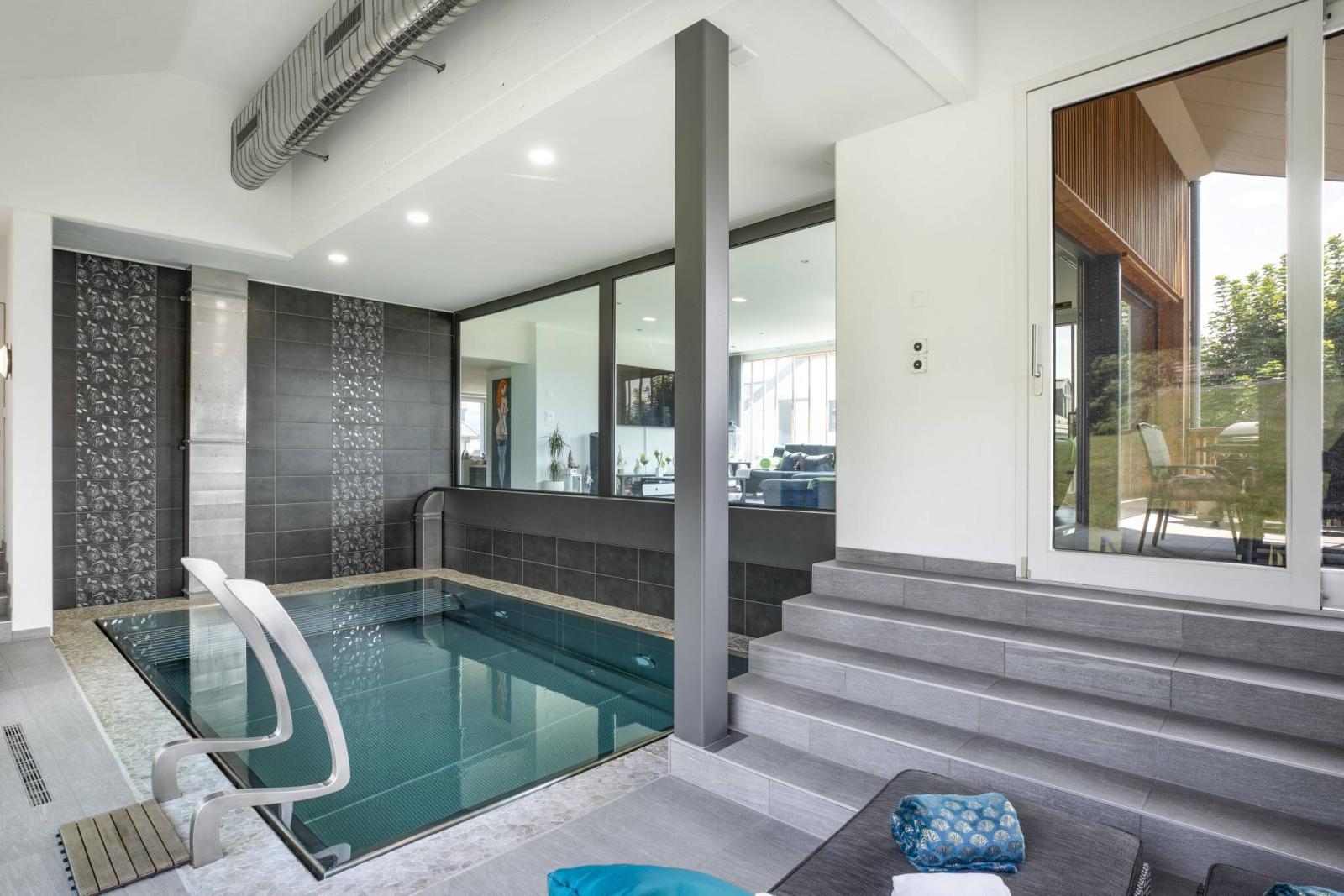 An incredible indoor infinity pool, made of stainless steel, with counter-current swimming and pressure water massages, adds undeniable value to this exceptional property.